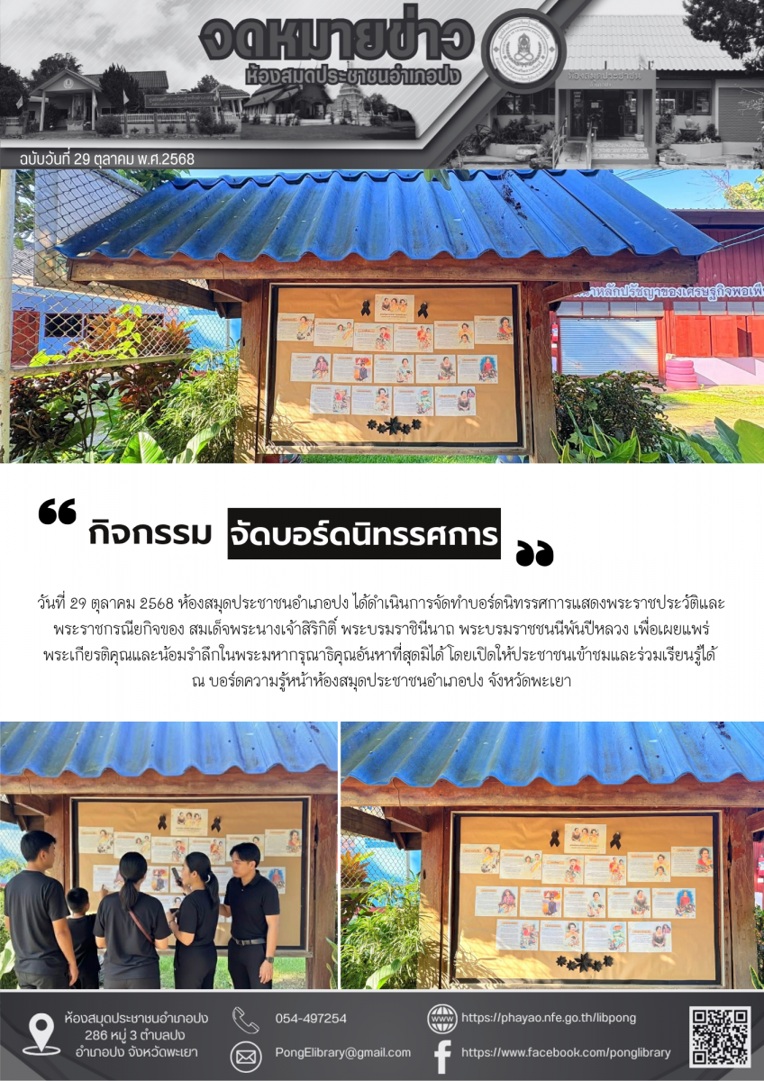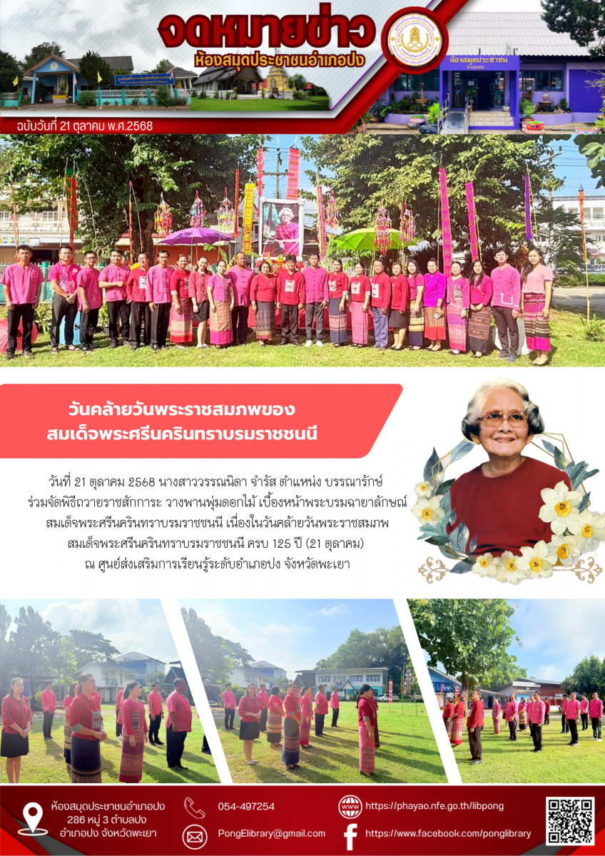 วันพุธที่ 5 พฤศจิกายน 2568 ห้องสมุดประชาชนจังหวัดพะเยา จัดโต๊ะถวายความอาลัยพระพันปีหลวง เพื่อแสดงความจงรักภักดีและน้อมรำลึกในพระมหากรุณาธิคุณอันหาที่ส...