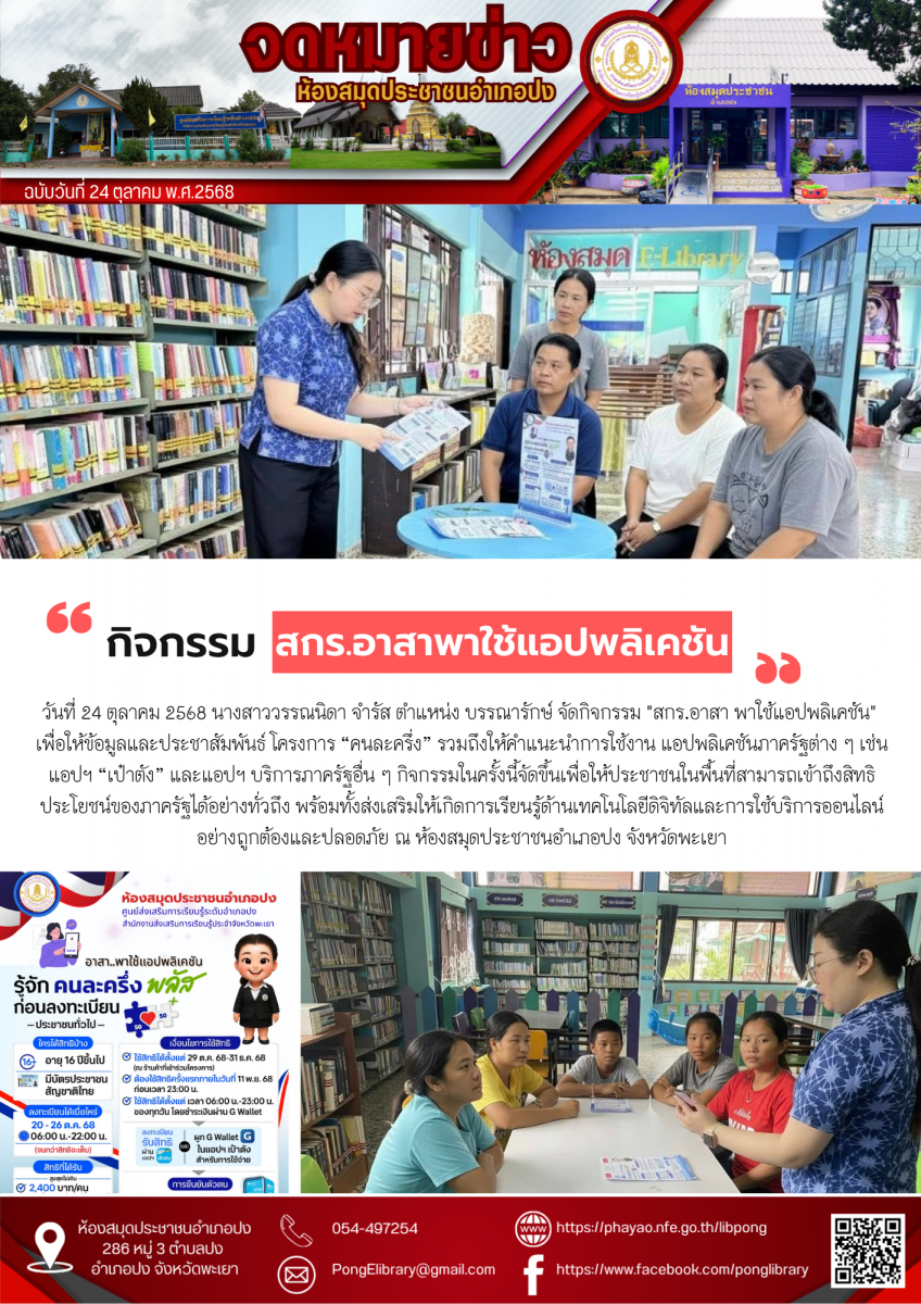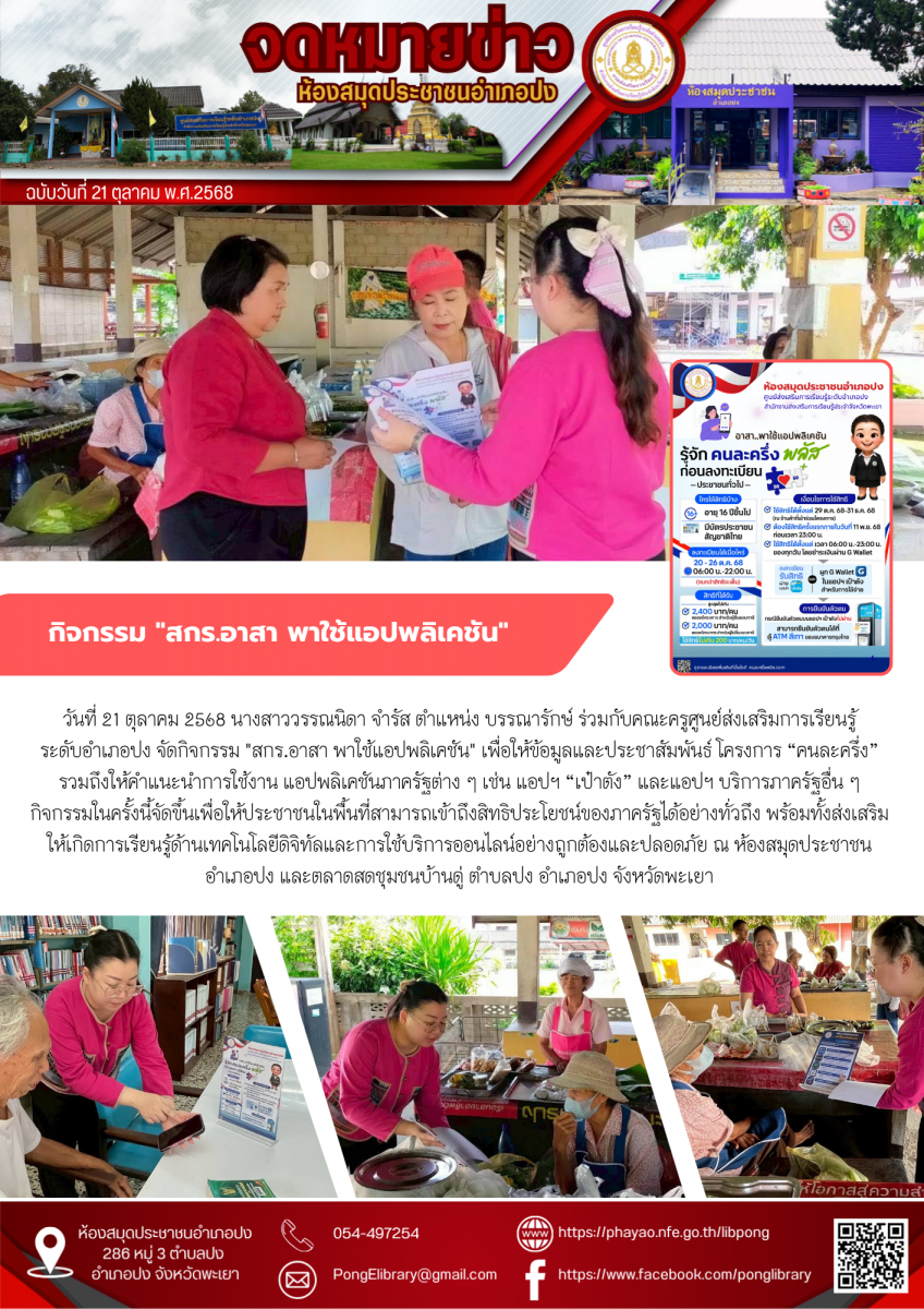 จัดกิจกรรม "สกร.อาสา พาใช้แอปพลิเคชัน" เพื่อให้ข้อมูลและประชาสัมพันธ์ โครงการ “คนละครึ่ง” รวมถึงให้คำแนะนำการใช้งาน แอปพลิเคชันภาครัฐต่าง ๆ เช่น แอปฯ ...