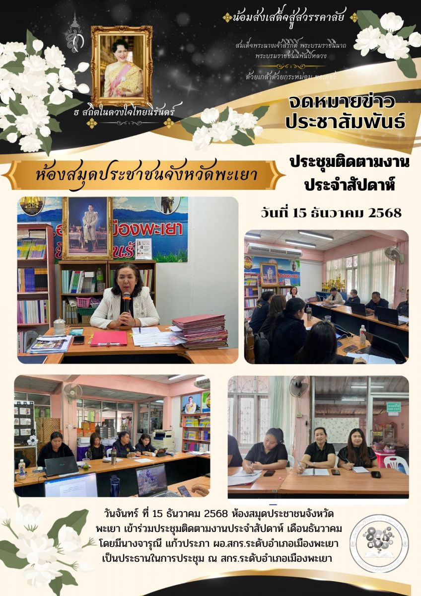 วันจันทร์ ที่ 15 ธันวาคม 2568 ห้องสมุดประชาชนจังหวัดพะเยา เข้าร่วมประชุมติดตามงานประจำสัปดาห์ เดือนธันวาคม โดยมีนางจารุณี แก้วประภา ผอ.สกร.ระดับอำเภอเ...