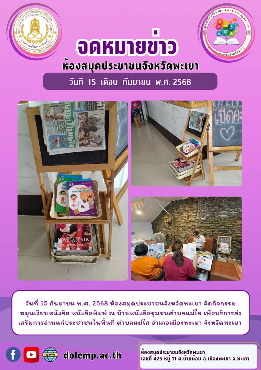 วันที่ 15 กันยายน พ.ศ. 2568 ห้องสมุดประชาชนจังหวัดพะเยา จัดกิจกรรมหมุนเวียนหนังสือ หนังสือพิมพ์ ณ บ้านหนังสือชุมชนตำบลแม่ใส เพื่อบริการส่งเสริมการอ่าน...
