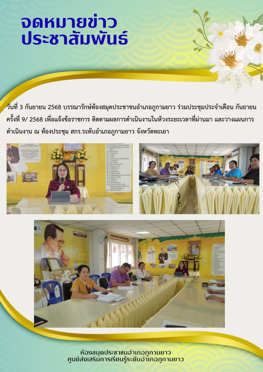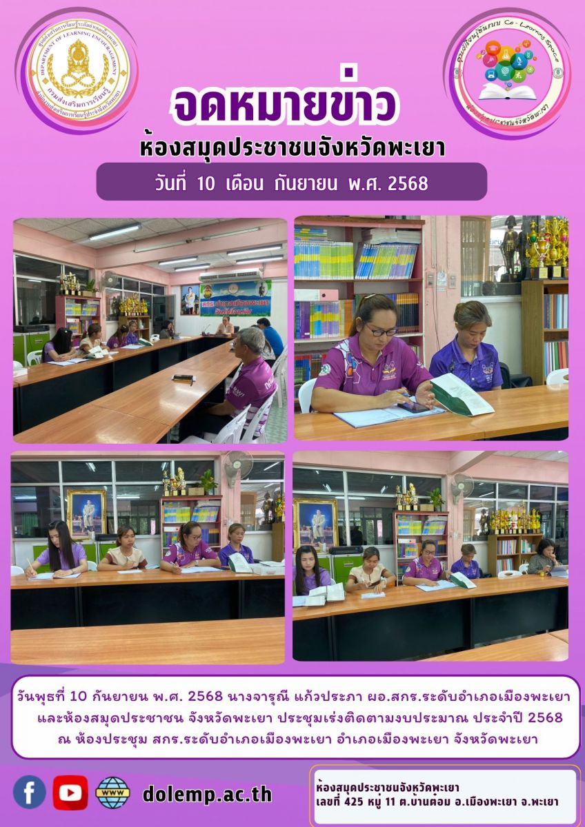 วันที่ 10 กันยายน พ.ศ. 2568 นางสาวเมธาพร ฝอยทอง ตำแหน่งบรรณารักษ์ชำนาญการพิเศษ และนางสาวมาลาตี อินทร์ประเสริฐ์ ตำแหน่งบรรณารักษ์ ประชุมประจำสัปดาห์ เด...