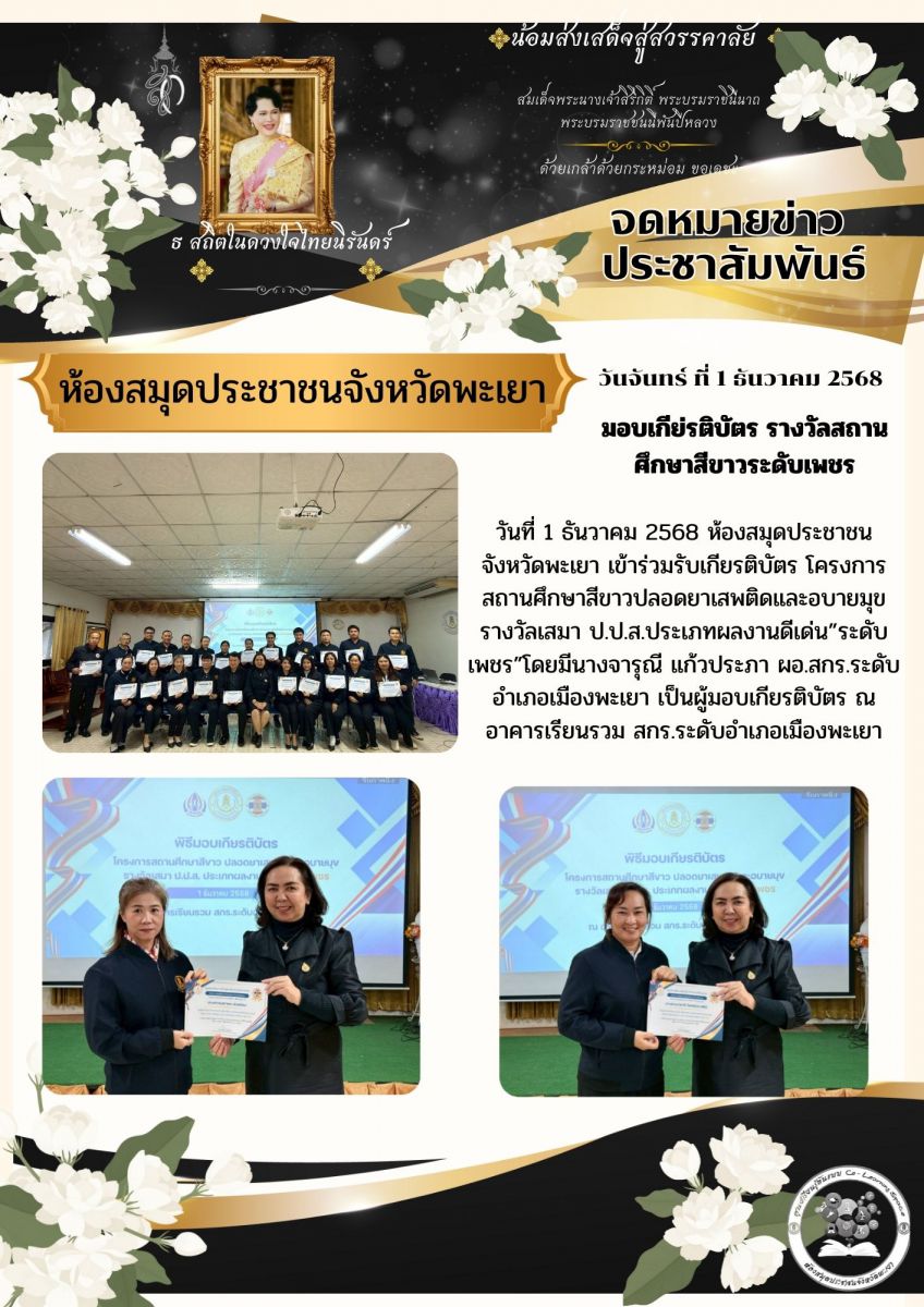 วันที่ 1 ธันวาคม 2568 ห้องสมุดประชาชนจังหวัดพะเยา เข้าร่วมรับเกียรติบัตร โครงการสถานศึกษาสีขาวปลอดยาเสพติดและอบายมุข รางวัลเสมา ป.ป.ส.ประเภทผลงานดีเด่...