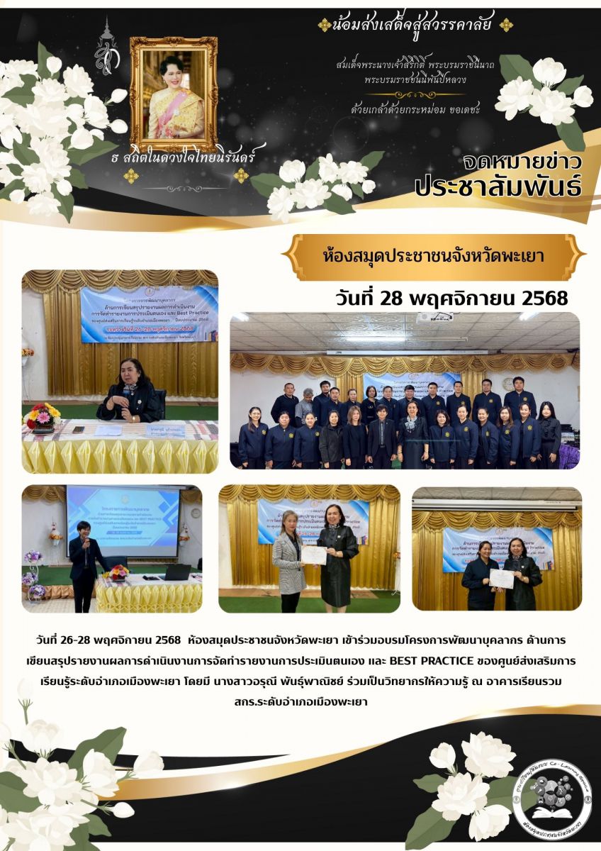 วันที่ 26-28 พฤศจิกายน 2568 ห้องสมุดประชาชนจังหวัดพะเยา เข้าร่วมอบรมโครงการพัฒนาบุคลากร ด้านการเขียนสรุปรายงานผลการดำเนินงานการจัดทำรายงานการประเมินต...