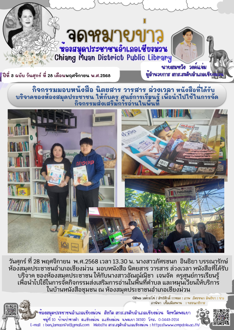 วันศุกร์ ที่ 28 พฤศจิกายน พ.ศ.2568 เวลา 13.30 น. นางสาวภัศรชนก อินธิยา บรรณารักษ์ห้องสมุดประชาชนอำเภอเชียงม่วน มอบหนังสือ นิตยสาร วารสาร ล่วงเวลา หนัง...
