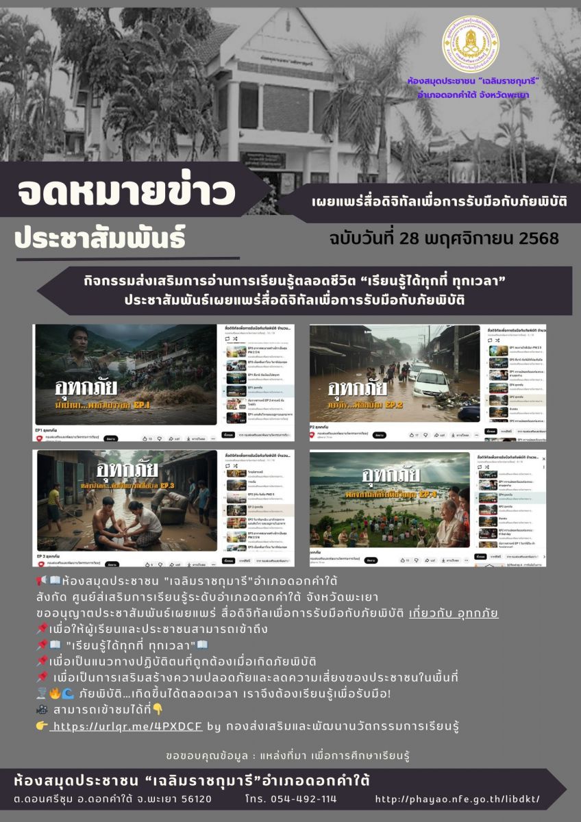 กิจกรรมส่งเสริมการอ่านการเรียนรู้ตลอดชีวิต “เรียนรู้ได้ทุกที่ ทุกเวลา”ประชาสัมพันธ์เผยแพร่สื่อดิจิทัลเพื่อการรับมือกับภัยพิบัติ...