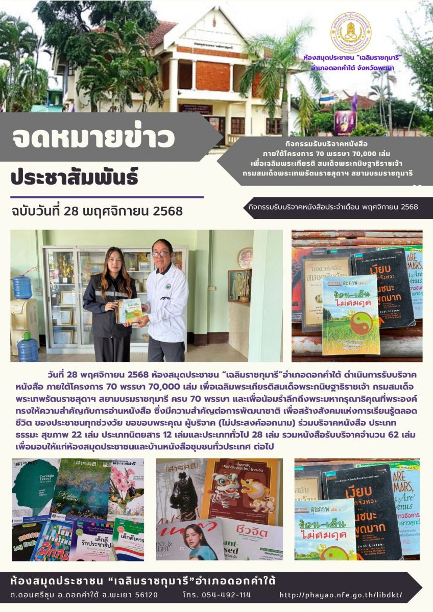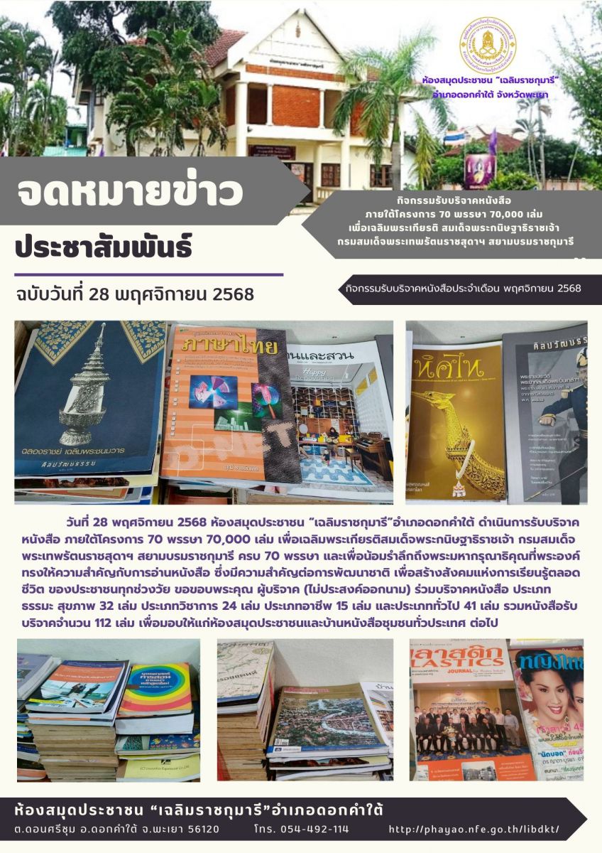 กิจกรรมรับบริจาคหนังสือ ภายใต้โครงการ 70 พรรษา 70,000 เล่ม เพื่อเฉลิมพระเกียรติ สมเด็จพระกนิษฐาธิราชเจ้า กรมสมเด็จพระเทพรัตนราชสุดาฯ สยามบรมราชกุมารีฯ...