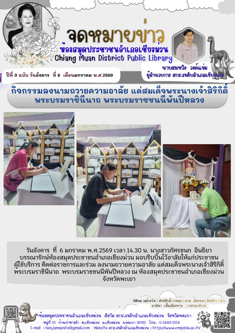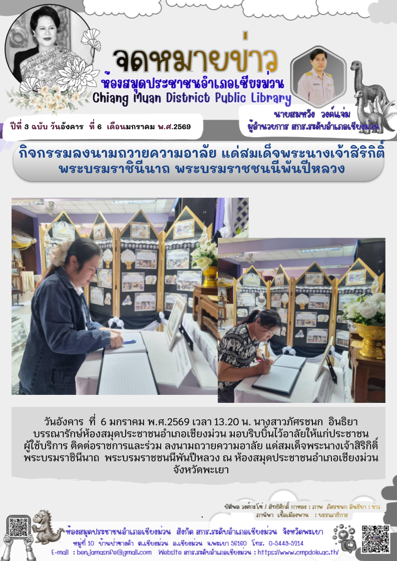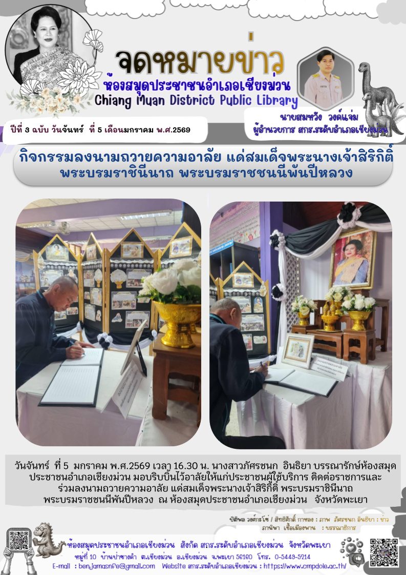 วันอังคาร ที่ 6 มกราคม พ.ศ.2569 เวลา 13.20 น. นางสาวภัศรชนก อินธิยา บรรณารักษ์ห้องสมุดประชาชนอำเภอเชียงม่วน ได้ดำเนินการมอบริบบิ้นไว้อาลัยให้แก่ปร...
