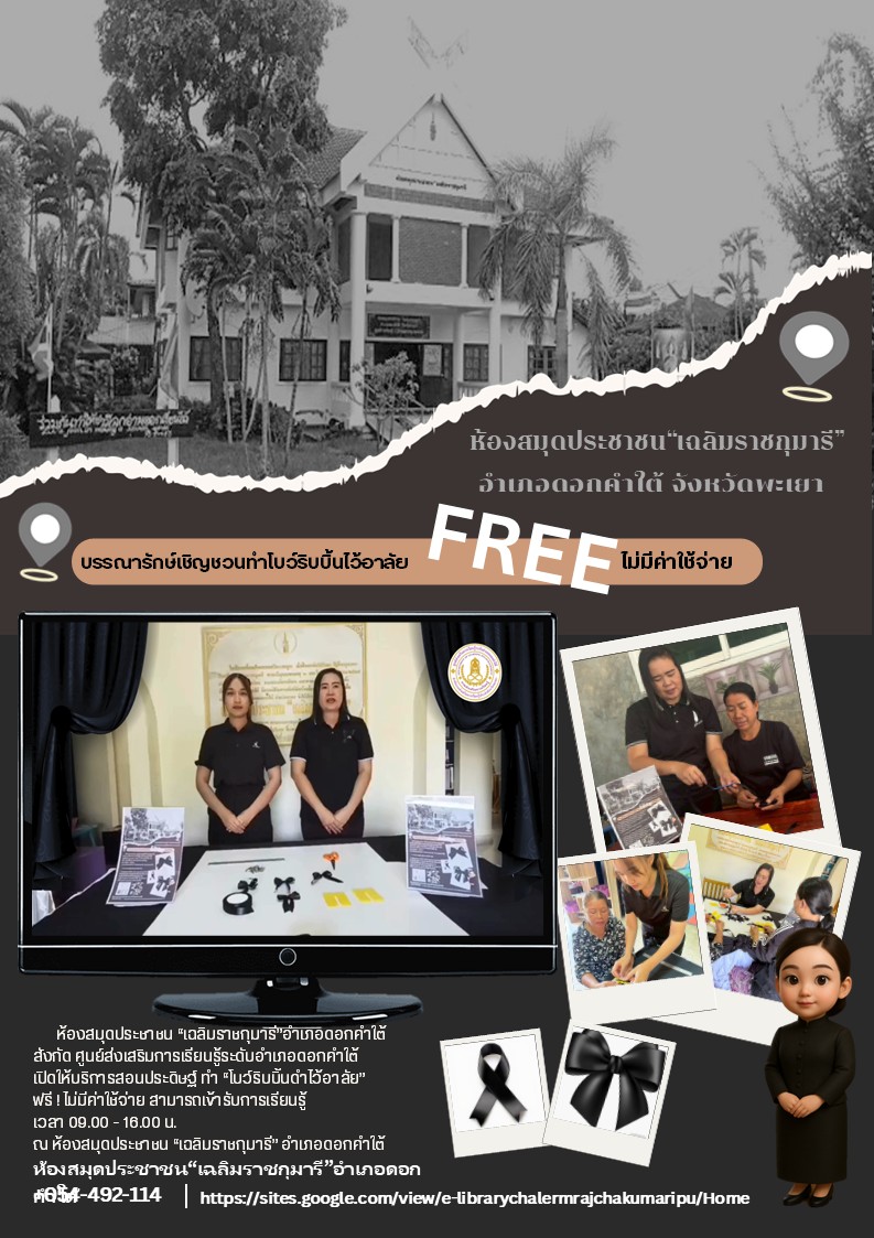 ห้องสมุดประชาชน “เฉลิมราชกุมารี”อำเภอดอกคำใต้ สังกัด ศูนย์ส่งเสริมการเรียนรู้ระดับอำเภอดอกคำใต้ เปิดให้บริการสอนประดิษฐ์ ทำ “โบว์ริบบิ้นดำไว้อาลัย” ฟ...
