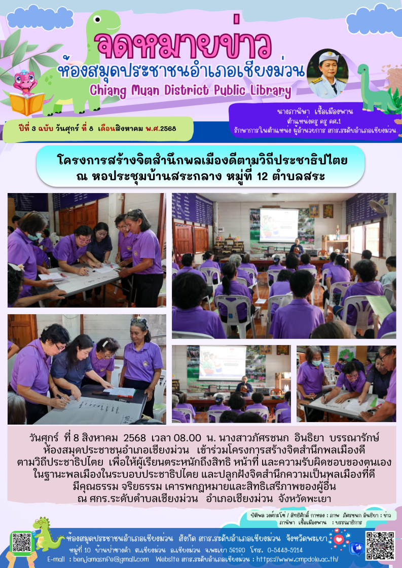 วันศุกร์ ที่ 8 สิงหาคม 2568 เวลา 08.00 น. นางสาวภัศรชนก อินธิยา บรรณารักษ์ ห้องสมุดประชาชนอำเภอเชียงม่วน เข้าร่วมโครงการสร้างจิตสำนึกพลเมืองดี ตา...
