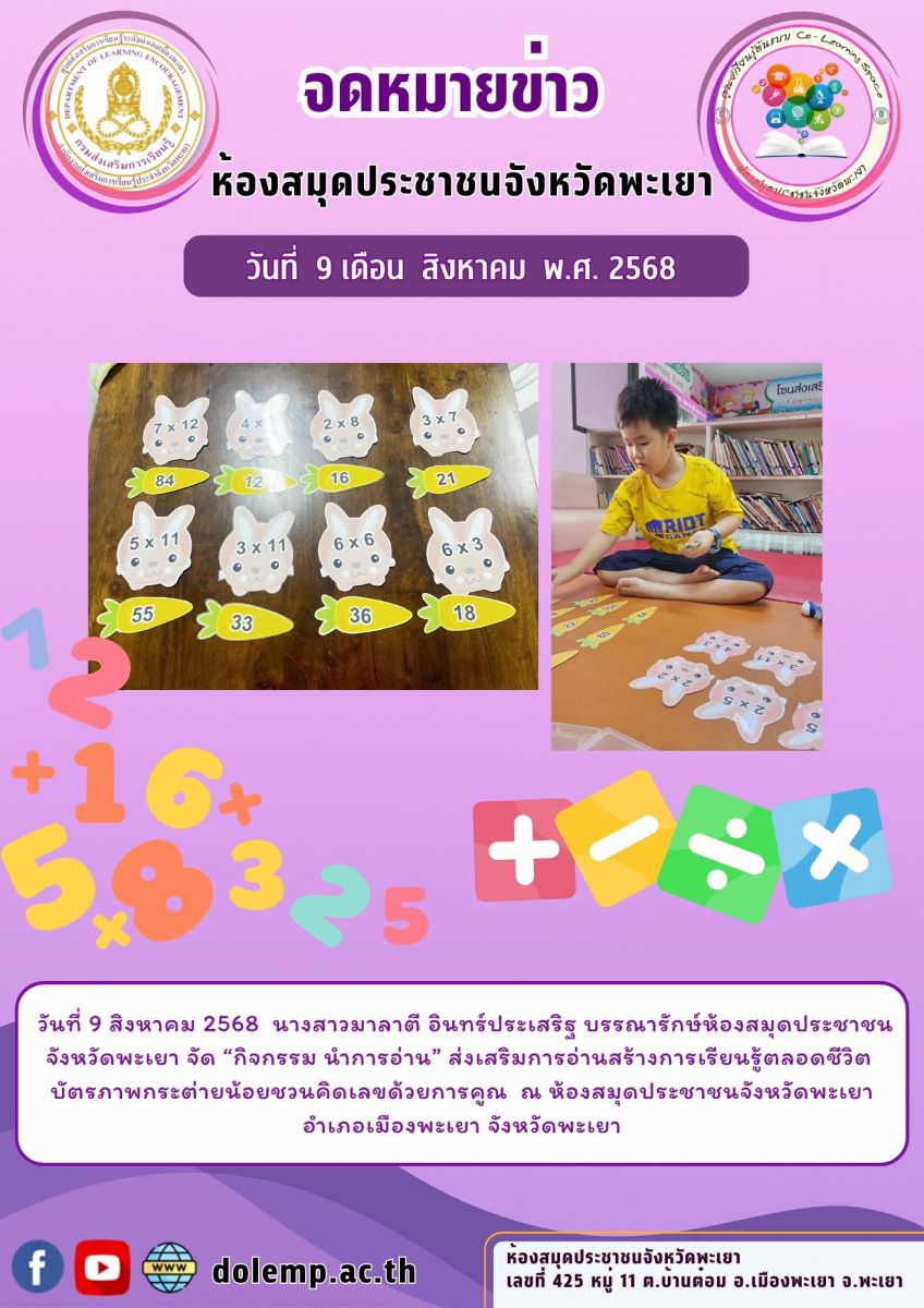 วันที่ 9 สิงหาคม 2568 นางสาวมาลาตี อินทร์ประเสริฐ บรรณารักษ์ห้องสมุดประชาชนจังหวัดพะเยา จัด “กิจกรรม นำการอ่าน” ส่งเสริมการอ่านสร้างการเรียนรู้ตลอดชี...