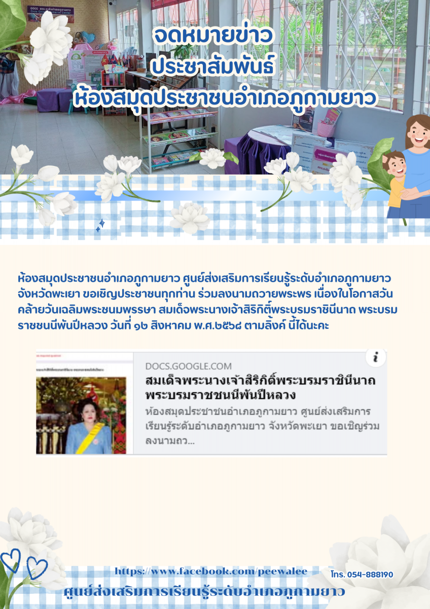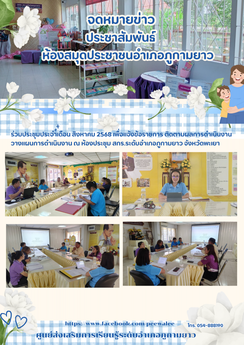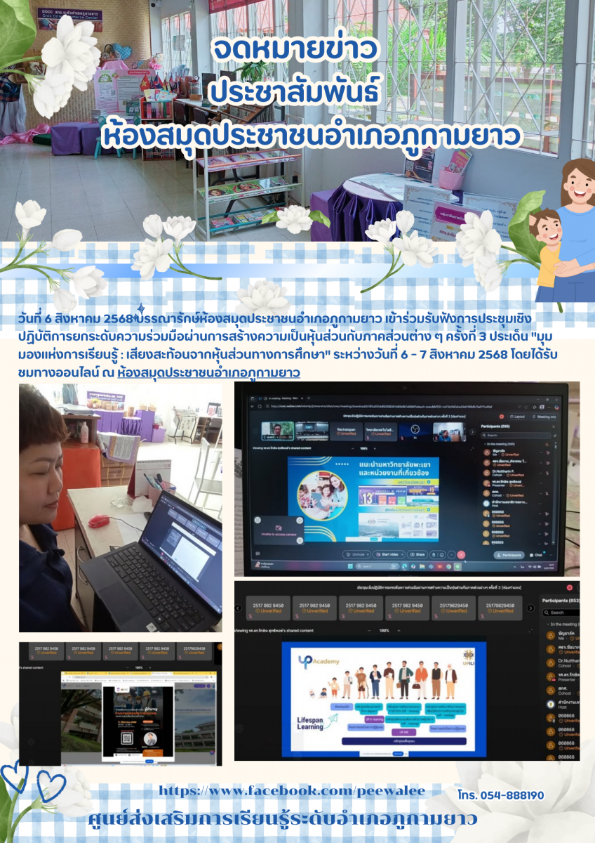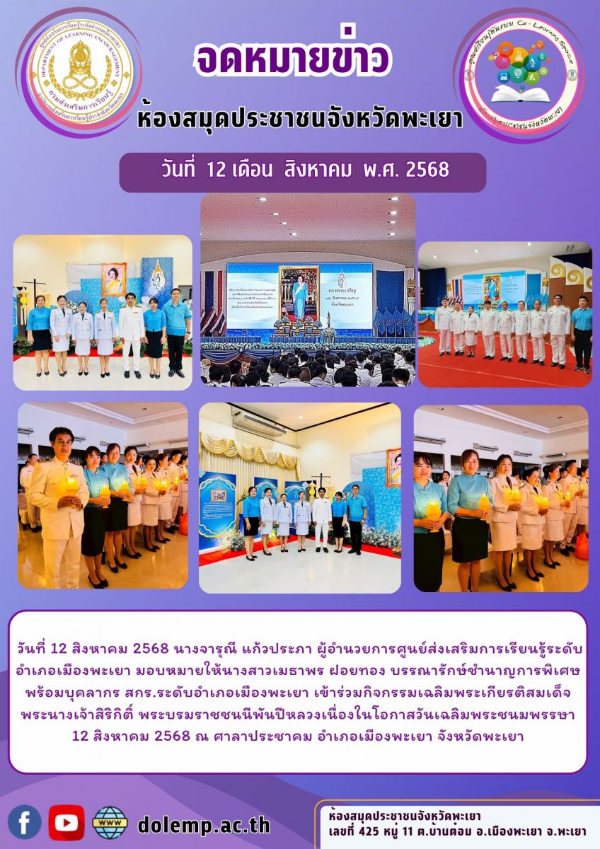วันที่ 12 สิงหาคม 2568 นางจารุณี แก้วประภา ผู้อำนวยการศูนย์ส่งเสริมการเรียนรู้ระดับอำเภอเมืองพะเยา มอบหมายให้นางสาวเมธาพร ฝอยทอง บรรณารักษ์ชำนาญการพิ...