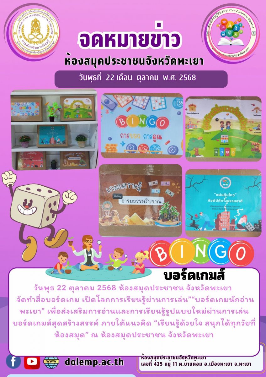 วันพุธ 22 ตุลาคม 2568 ห้องสมุดประชาชน จังหวัดพะเยา จัดทำสื่อบอร์ดเกม เปิดโลกการเรียนรู้ผ่านการเล่น”“บอร์ดเกมนักอ่านพะเยา” เพื่อส่งเสริมการอ่านและการ...