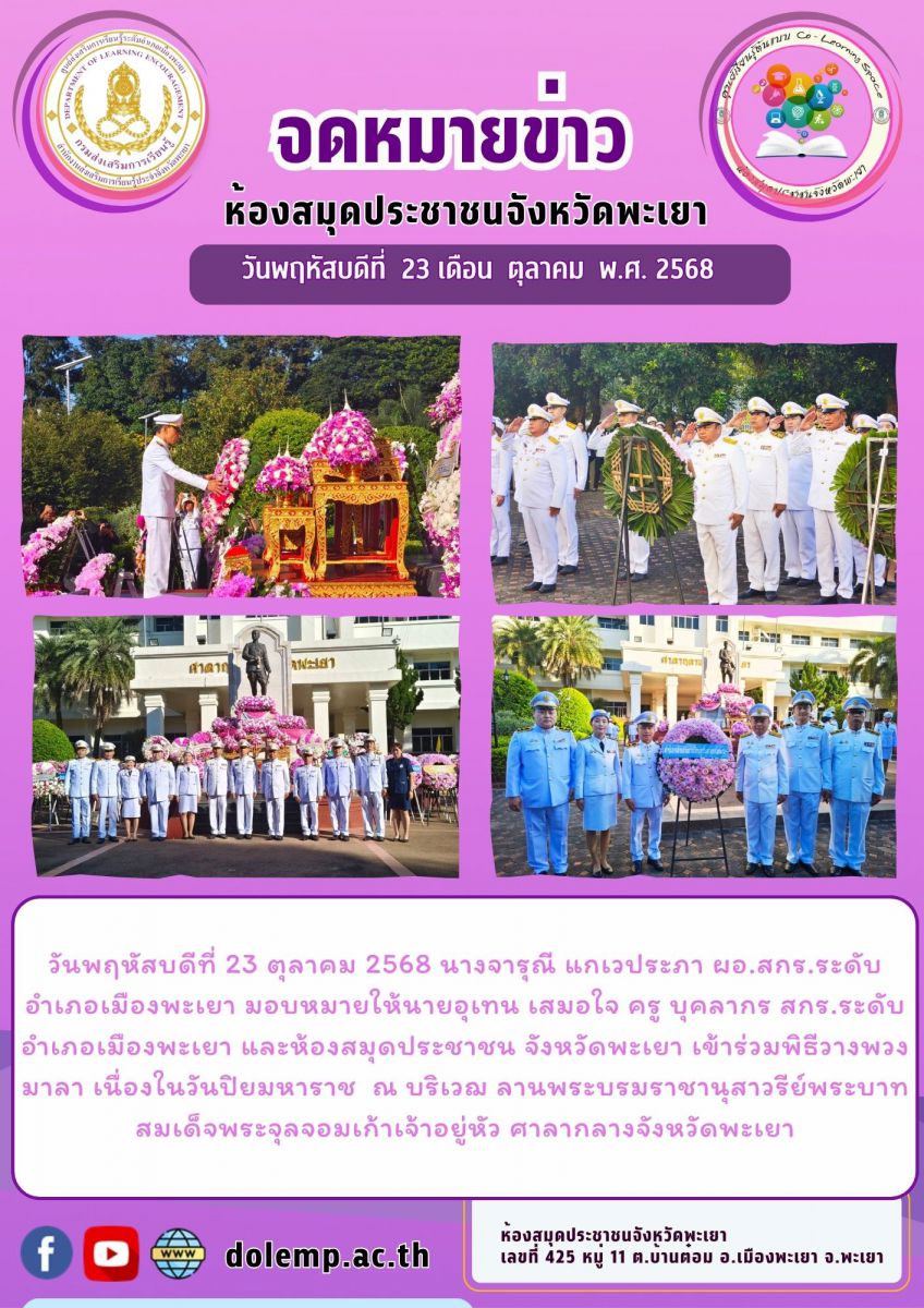 วันพฤหัสบดีที่ 23 ตุลาคม 2568 นางจารุณี แก้วประภา ผอ.สกร.ระดับอำเภอเมืองพะเยา มอบหมายให้นายอุเทน เสมอใจ ครู บุคลากร สกร.ระดับอำเภอเมืองพะเยา และห้องสม...