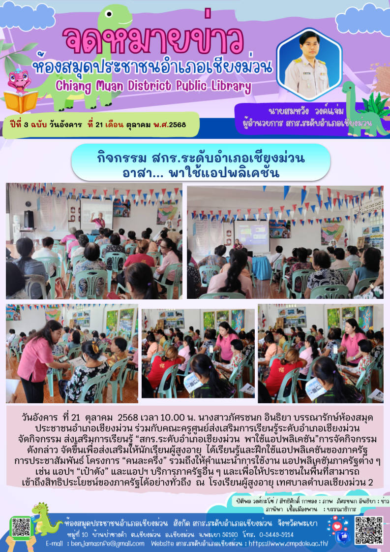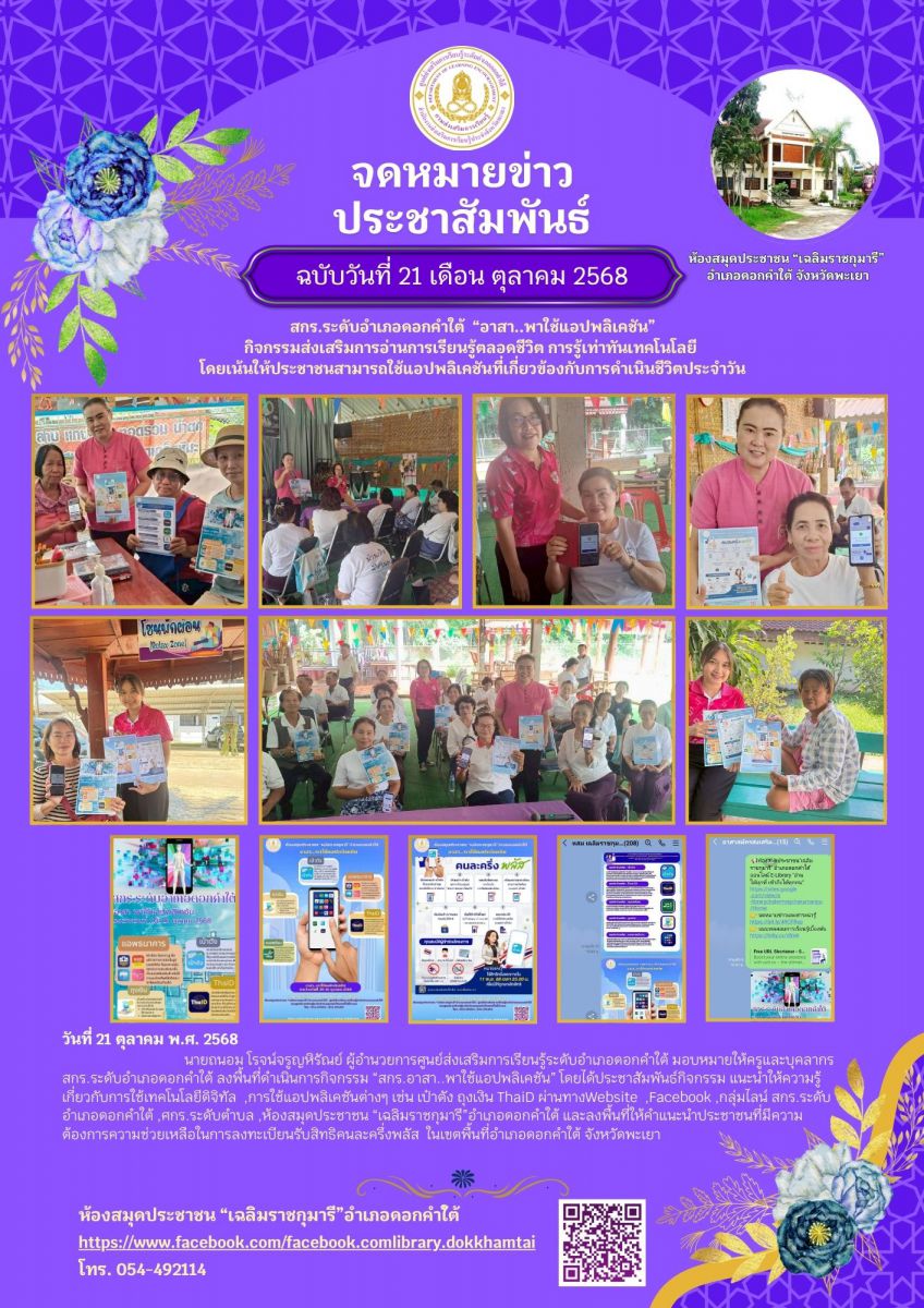 สกร.ระดับอำเภอดอกคำใต้ “อาสา..พาใช้แอปพลิเคชัน” กิจกรรมส่งเสริมการอ่านการเรียนรู้ตลอดชีวิต การรู้เท่าทันเทคโนโลยี โดยเน้นให้ประชาชนสามารถใช้แอปพลิเค...