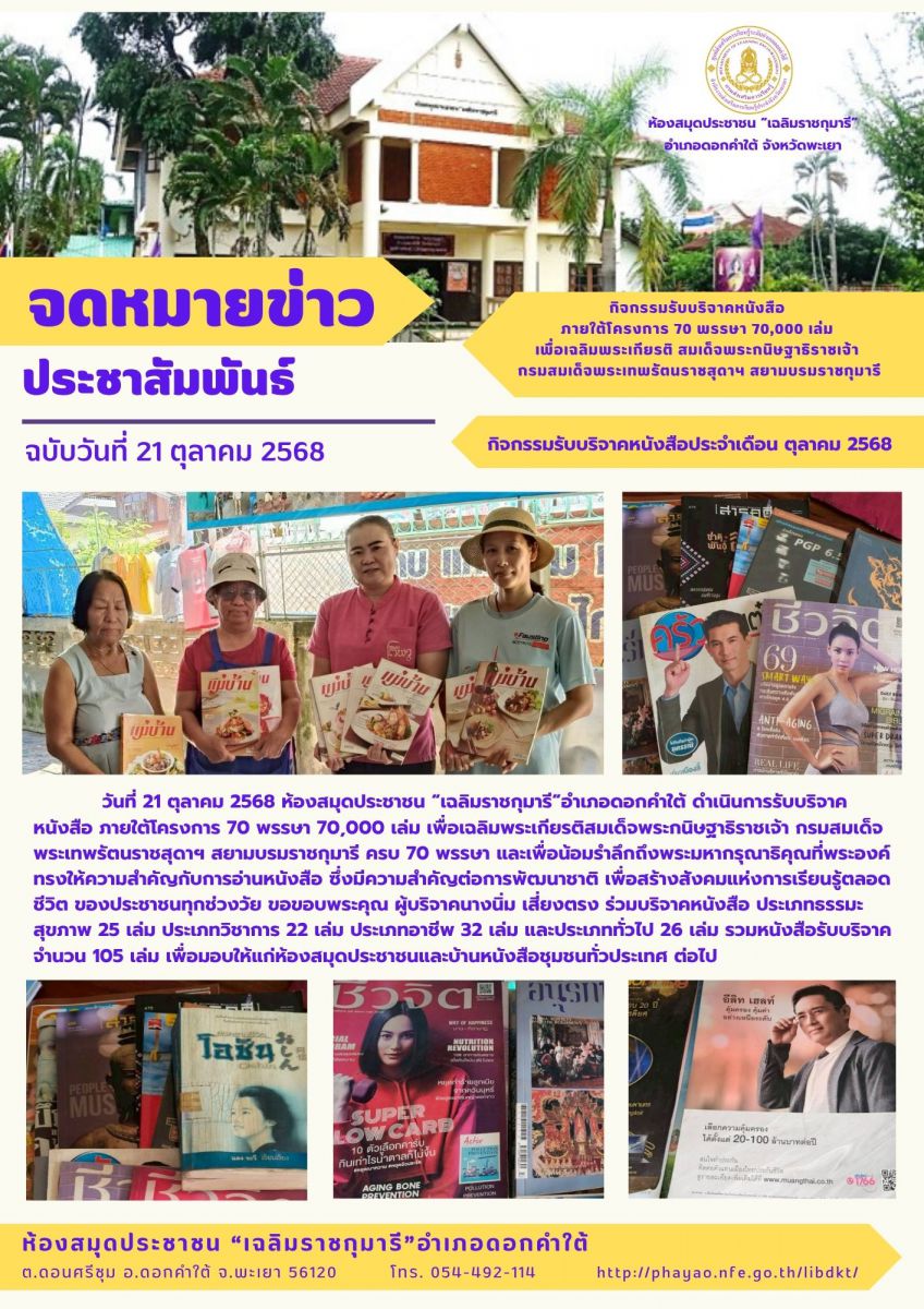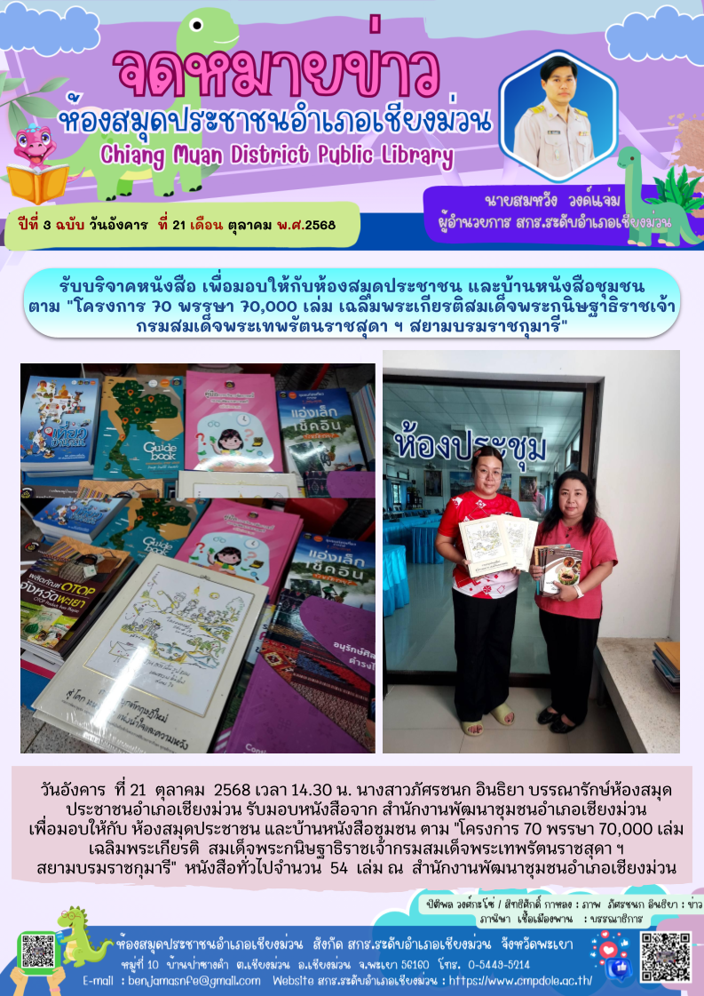 วันอังคาร ที่ 21 ตุลาคม 2568 เวลา 14.30 น. นางสาวภัศรชนก อินธิยา บรรณารักษ์ห้องสมุดประชาชนอำเภอเชียงม่วน รับมอบหนังสือจากสำนักงานพัฒนาชุมชนอำเภอเชียง...
