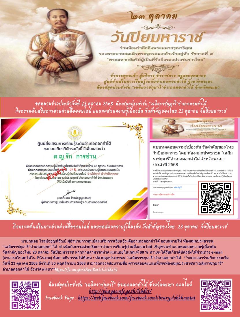 กิจกรรมส่งเสริมการอ่านผ่านสื่อออนไลน์ แบบทดสอบความรู้เบื้องต้น วันสำคัญของไทย 23 ตุลาคม วันปิยมหาราช...