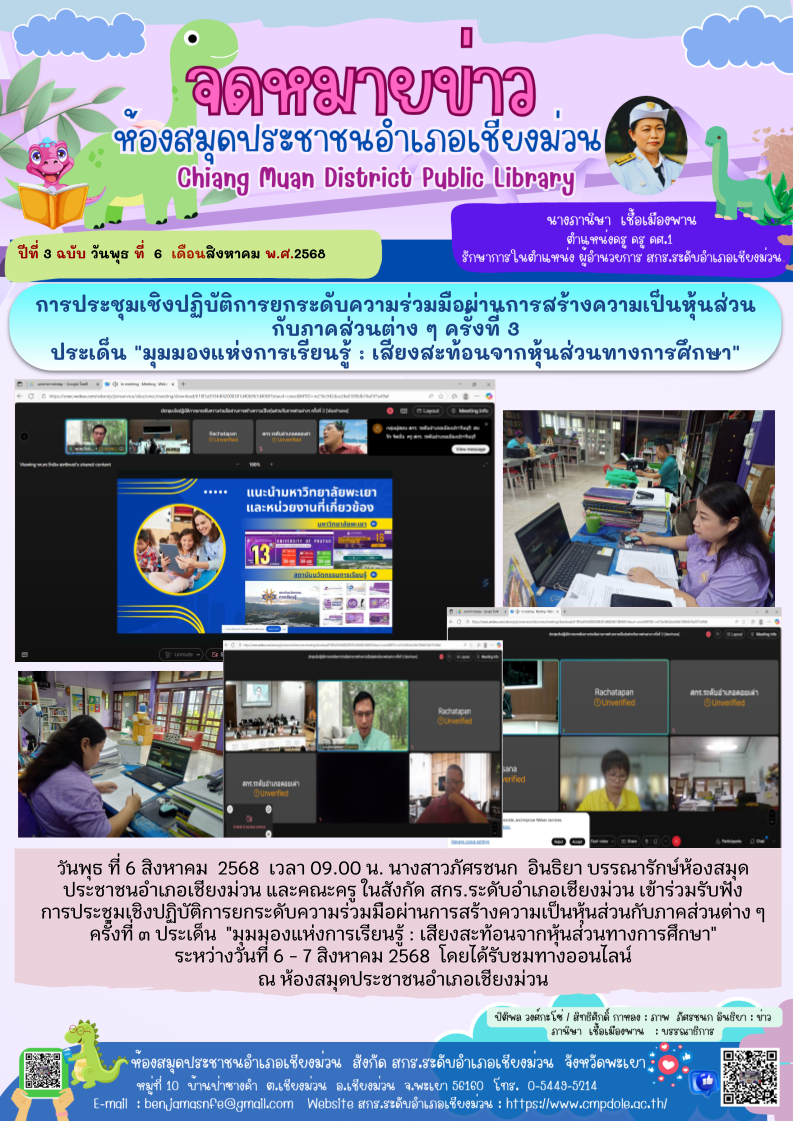 วันพุธ ที่ 6 สิงหาคม 2568 เวลา 09.00 น. นางสาวภัศรชนก อินธิยา บรรณารักษ์ห้องสมุดประชาชนอำเภอเชียงม่วน และคณะครู ในสังกัดสกร.ระดับอำเภอเชียงม่วน เข้...