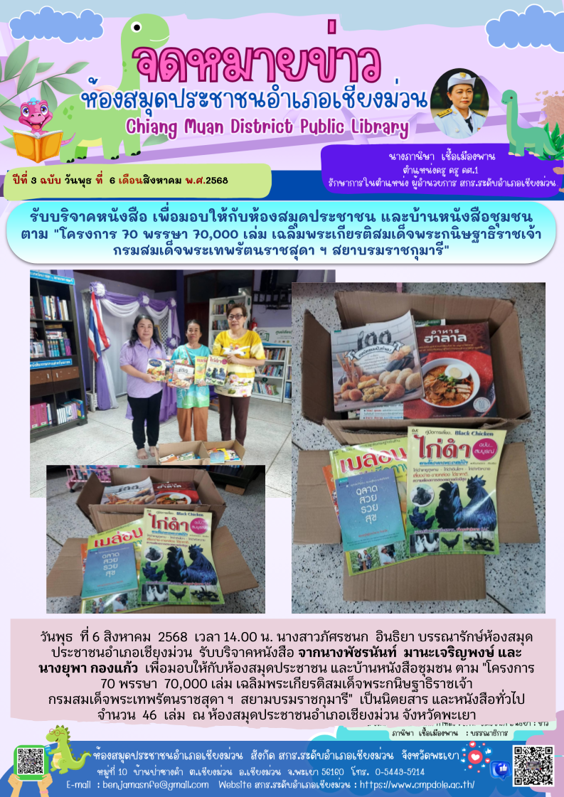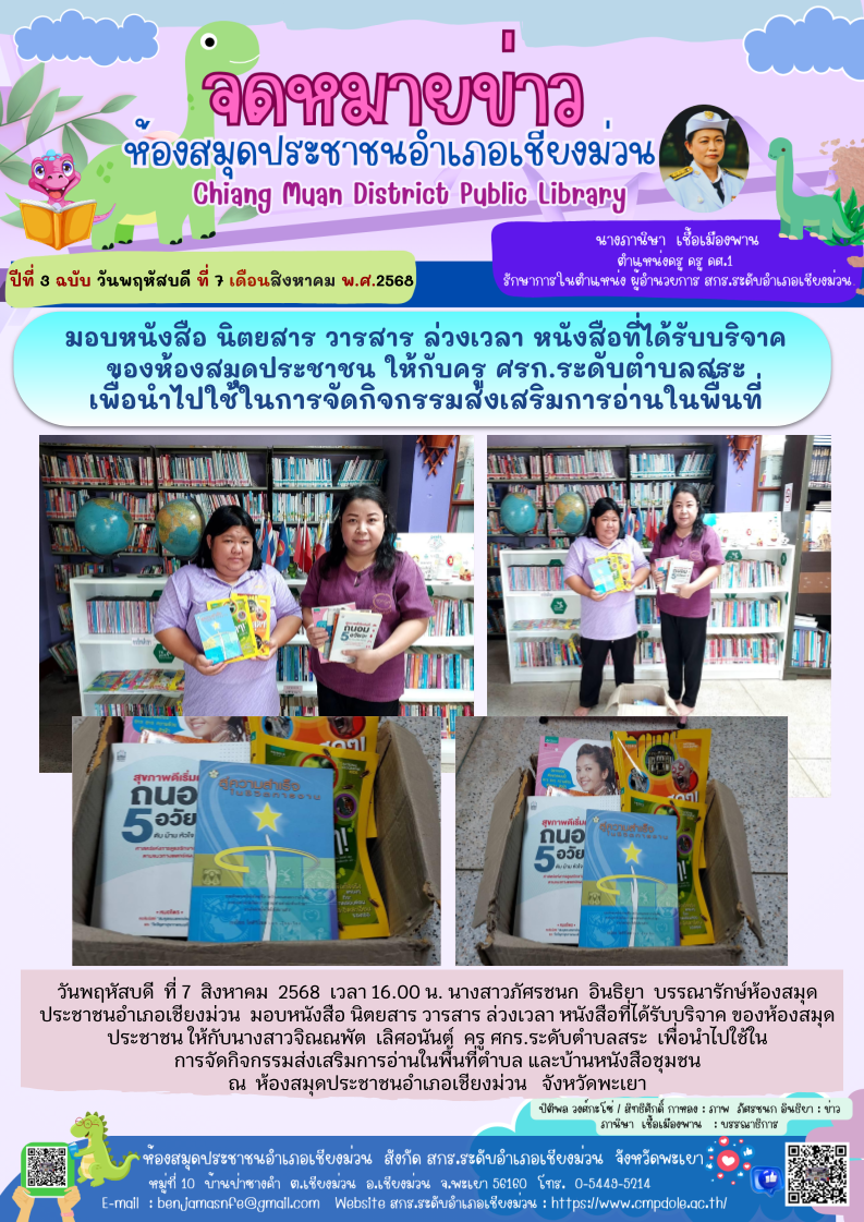 วันพฤหัสบดี ที่ 7 สิงหาคม 2568 เวลา 16.00 น. นางสาวภัศรชนก อินธิยา บรรณารักษ์ห้องสมุดประชาชนอำเภอเชียงม่วน มอบหนังสือ นิตยสาร วารสาร ล่วงเวลา หนังส...
