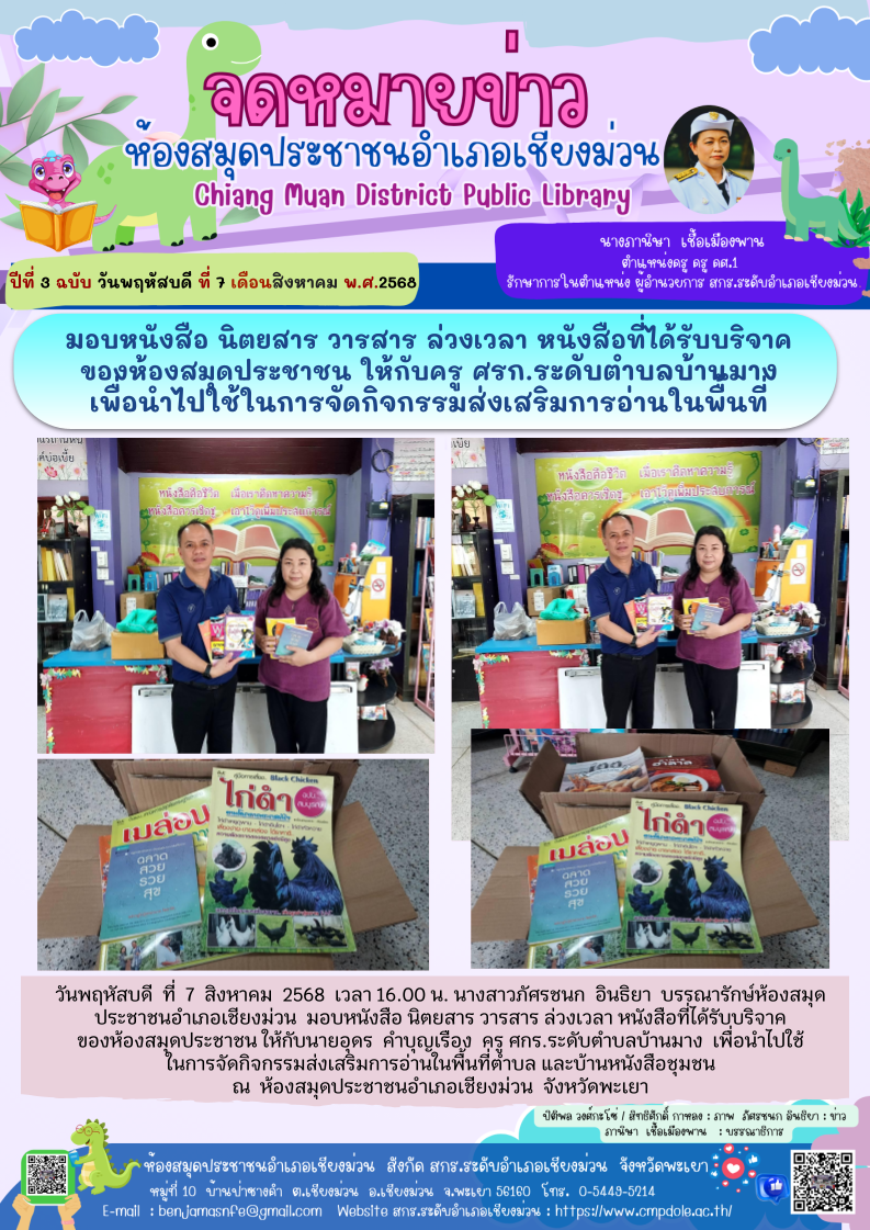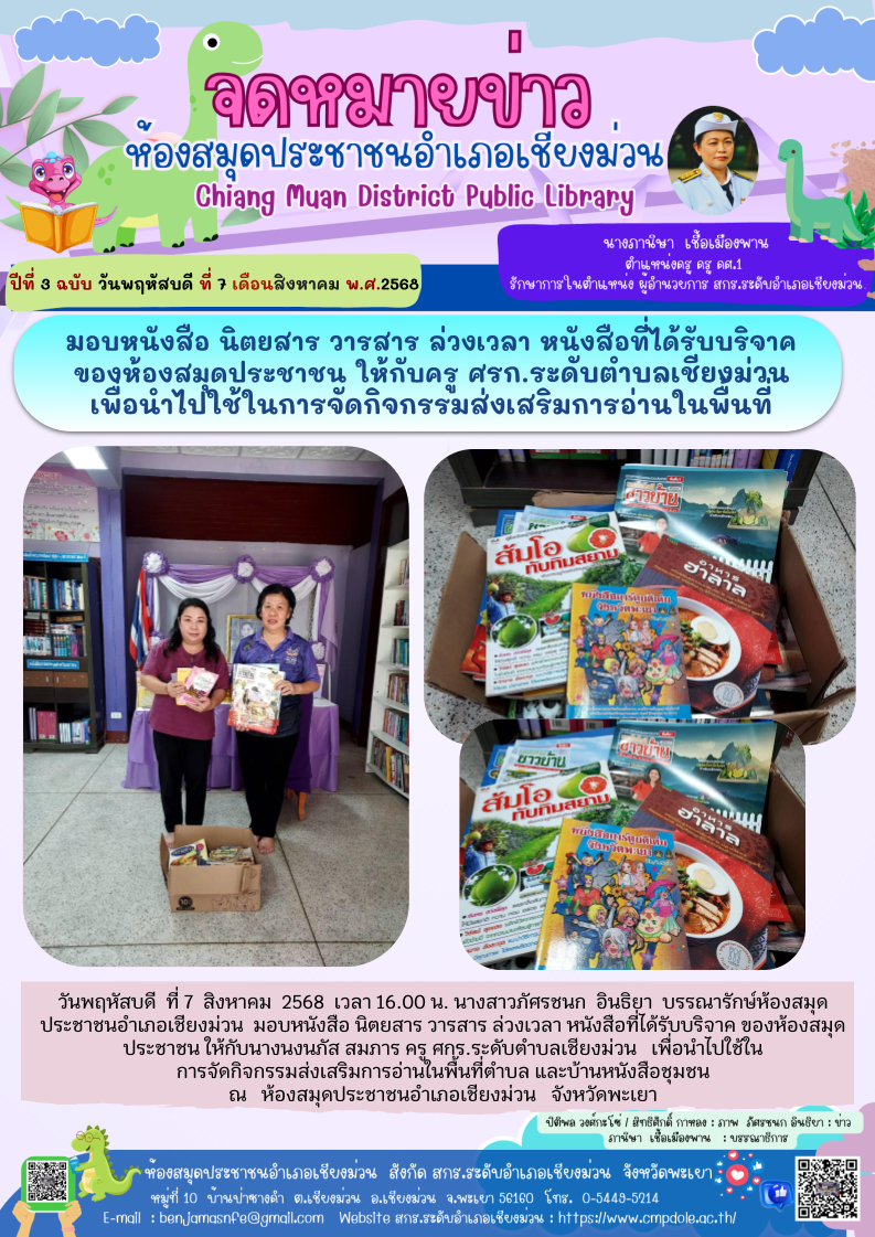วันพฤหัสบดี ที่ 7 สิงหาคม 2568 เวลา 16.00 น. นางสาวภัศรชนก อินธิยา บรรณารักษ์ห้องสมุดประชาชนอำเภอเชียงม่วน มอบหนังสือ นิตยสาร วารสาร ล่วงเวลา หนังสื...