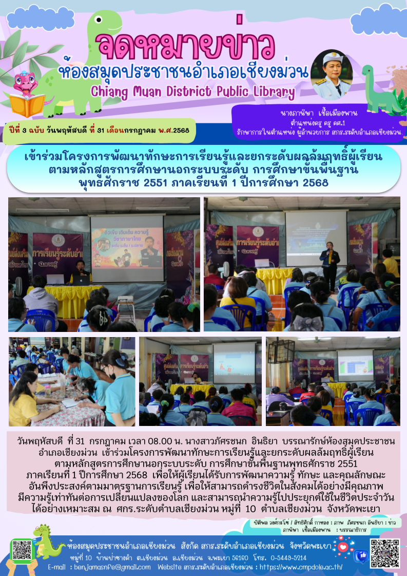 วันพฤหัสบดี ที่ 31 กรกฎาคม เวลา 08.00 น. นางสาวภัศรชนก อินธิยา บรรณารักษ์ห้องสมุดประชาชนอำเภอเชียงม่วน เข้าร่วมโครงการพัฒนาทักษะการเรียนรู้และยกระ...
