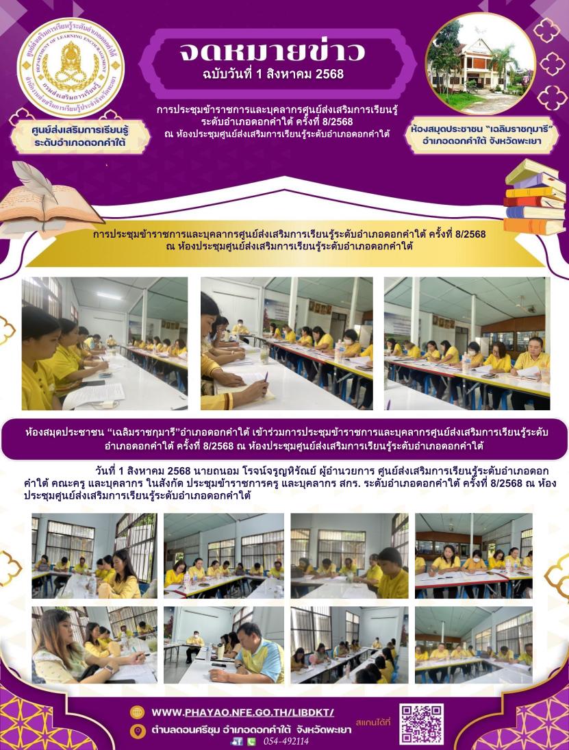 ห้องสมุดประชาชน “เฉลิมราชกุมารี”อำเภอดอกคำใต้ เข้าร่วมการประชุมข้าราชการและบุคลากรศูนย์ส่งเสริมการเรียนรู้ระดับอำเภอดอกคำใต้ ครั้งที่ 8/2568 ณ ห้องปร...