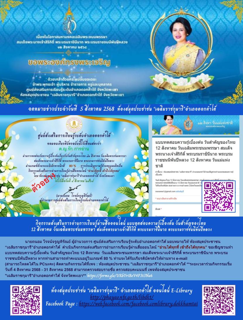 กิจกรรมส่งเสริมการอ่านการเรียนรู้ผ่านสื่อออนไลน์ แบบทดสอบความรู้เบื้องต้น วันสำคัญของไทย 12 สิงหาคม วันเฉลิมพระชนมพรรษา สมเด็จพระนางเจ้าสิริกิติ์ ...