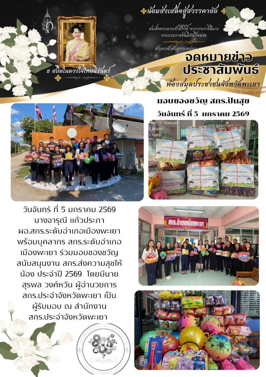 วันจันทร์ ที่ 5 มกราคม 2569 นางจารุณี แก้วประภา ผอ.สกร.ระดับอำเภอเมืองพะเยา พร้อมบุคลากร สกร.ระดับอำเภอเมืองพะเยา ร่วมมอบของขวัญ สนับสนุนงาน สกร.ส่งคว...