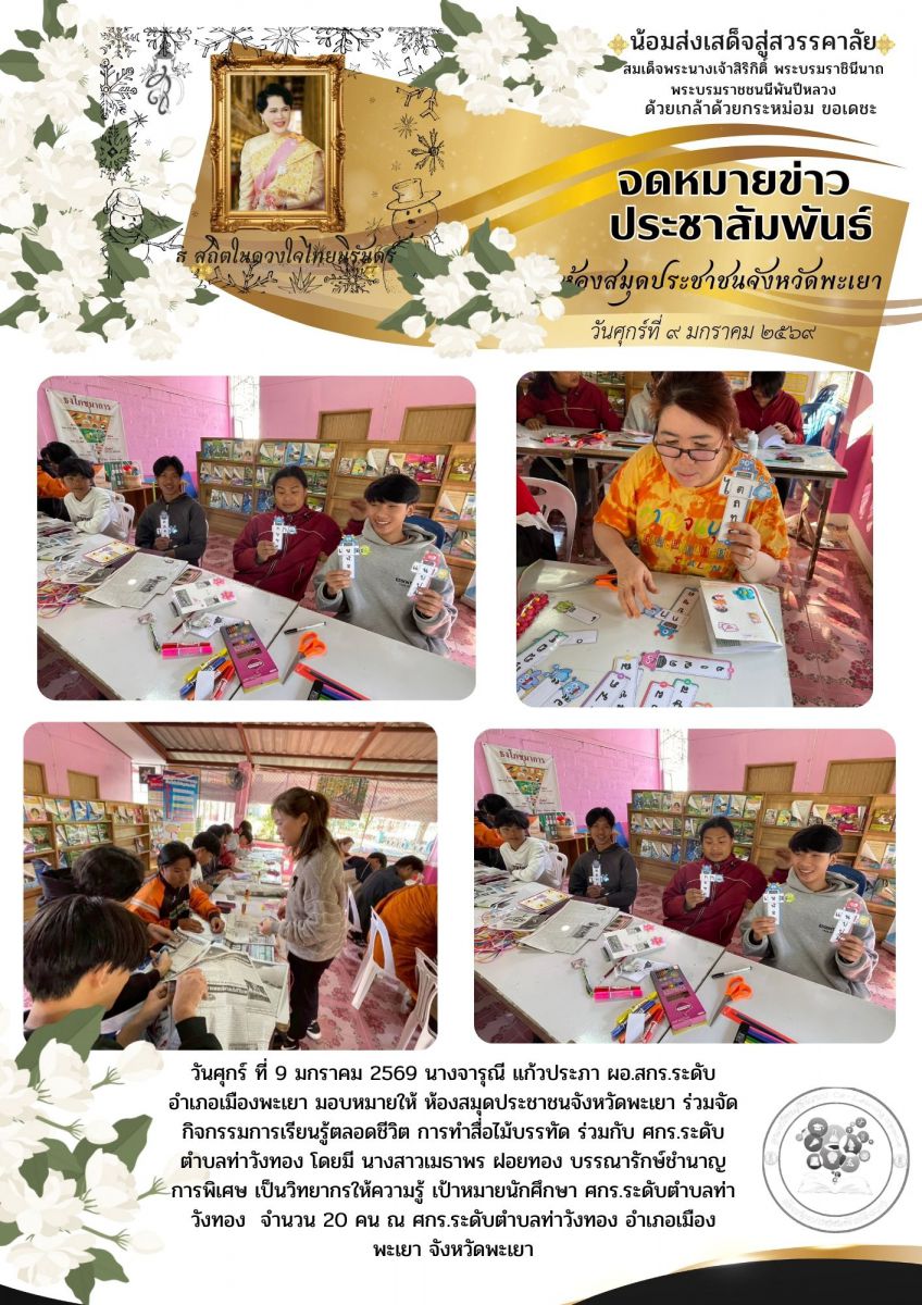 วันศุกร์ ที่ 9 มกราคม 2569 นางจารุณี แก้วประภา ผอ.สกร.ระดับอำเภอเมืองพะเยา มอบหมายให้ ห้องสมุดประชาชนจังหวัดพะเยา ร่วมจัดกิจกรรมการเรียนรู้ตลอดชีวิต ก...