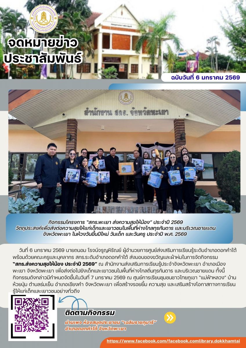 กิจกรรมโครงการ “สกร.พะเยา ส่งความสุขให้น้อง” ประจำปี 2569 วัตถุประสงค์เพื่อส่งต่อความสุขให้แก่เด็กและเยาวชนในพื้นที่ห่างไกลทุรกันดาร และบริเวณชายแดน จ...