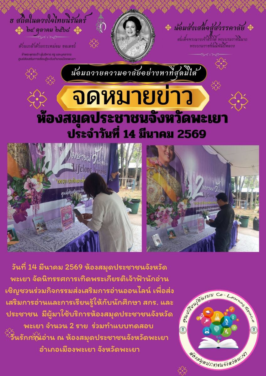 วันที่ 14 มีนาคม 2569 ห้องสมุดประชาชนจังหวัดพะเยา จัดนิทรรศการเทิดพระเกียรติเจ้าฟ้านักอ่าน เชิญชวนร่วมกิจกรรมส่งเสริมการอ่านออนไลน์ เพื่อส่งเสริมการอ่...