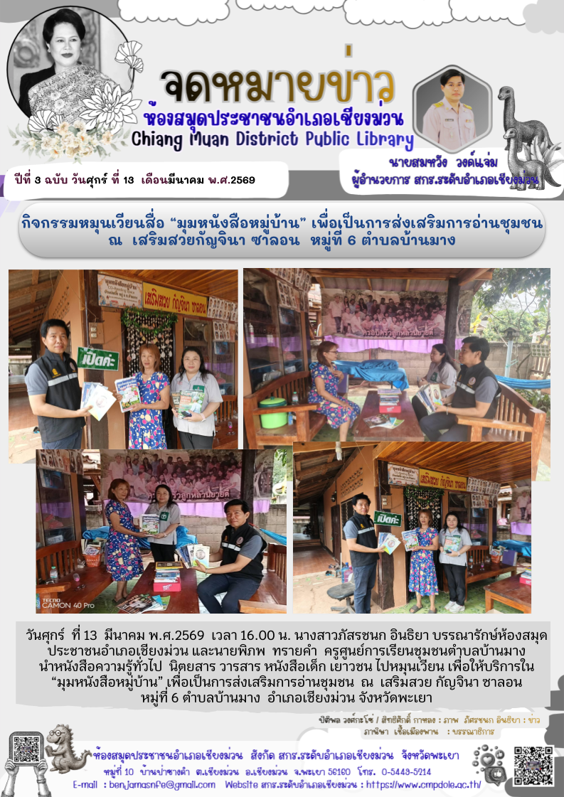 วันศุกร์ ที่ 13 มีนาคม พ.ศ.2569 เวลา 16.00 น. นางสาวภัศรชนก อินธิยา บรรณารักษ์ห้องสมุดประชาชนอำเภอเชียงม่วน และนายพิภพ ทรายคำ ครูศูนย์การเรียนชุมชน...