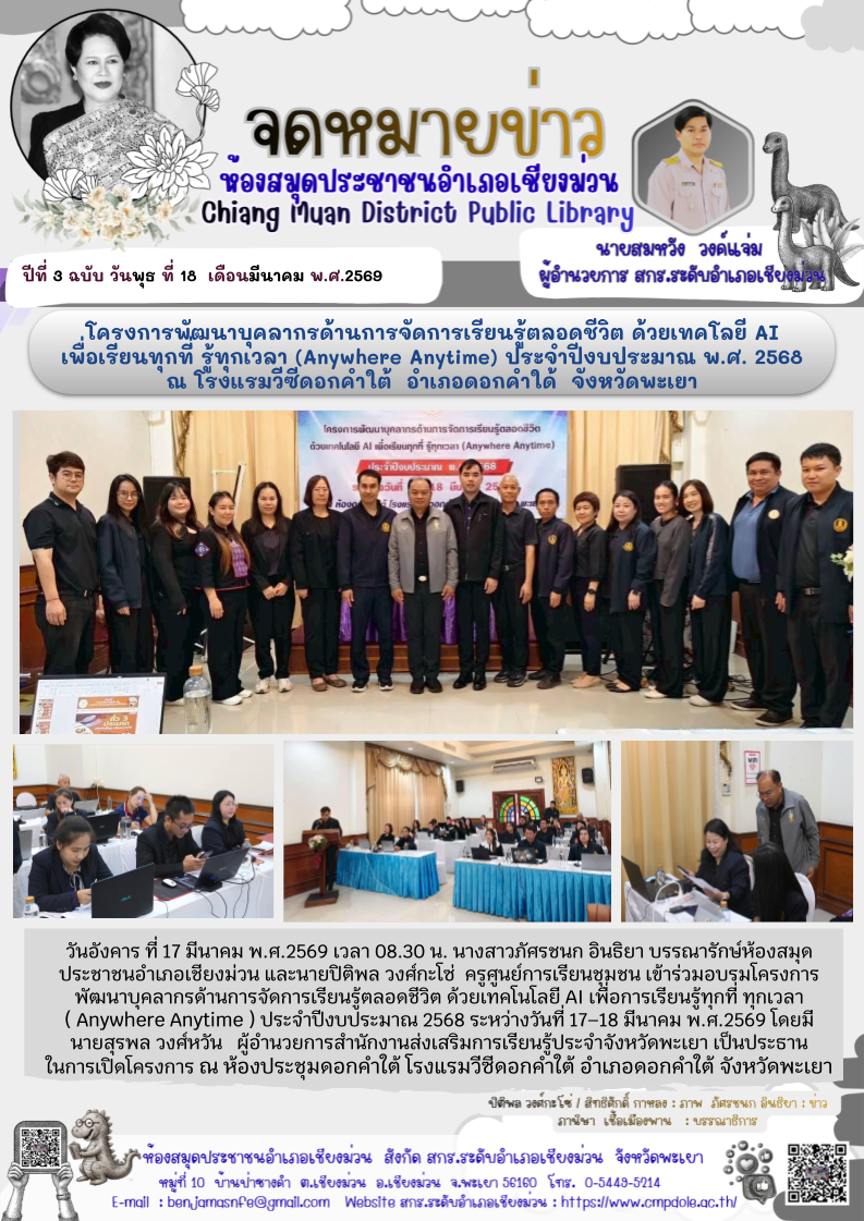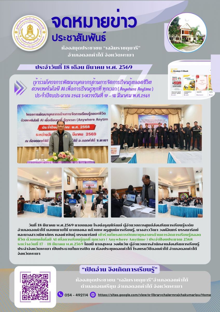 วันที่ 1ึ7-18 มีนาคม 2569 นางจารุณี แก้วประภา ผู้อำนวยการศูนย์ส่งเสริมการเียนรู้ระดับอำเภอเมืองพะเยา มอบหมายให้ นางสาวเมธาพร ฝอยทอง บรรณารักษ์ชำนาญกา...