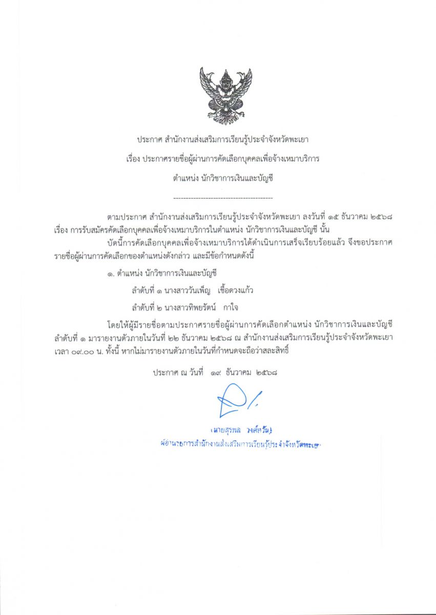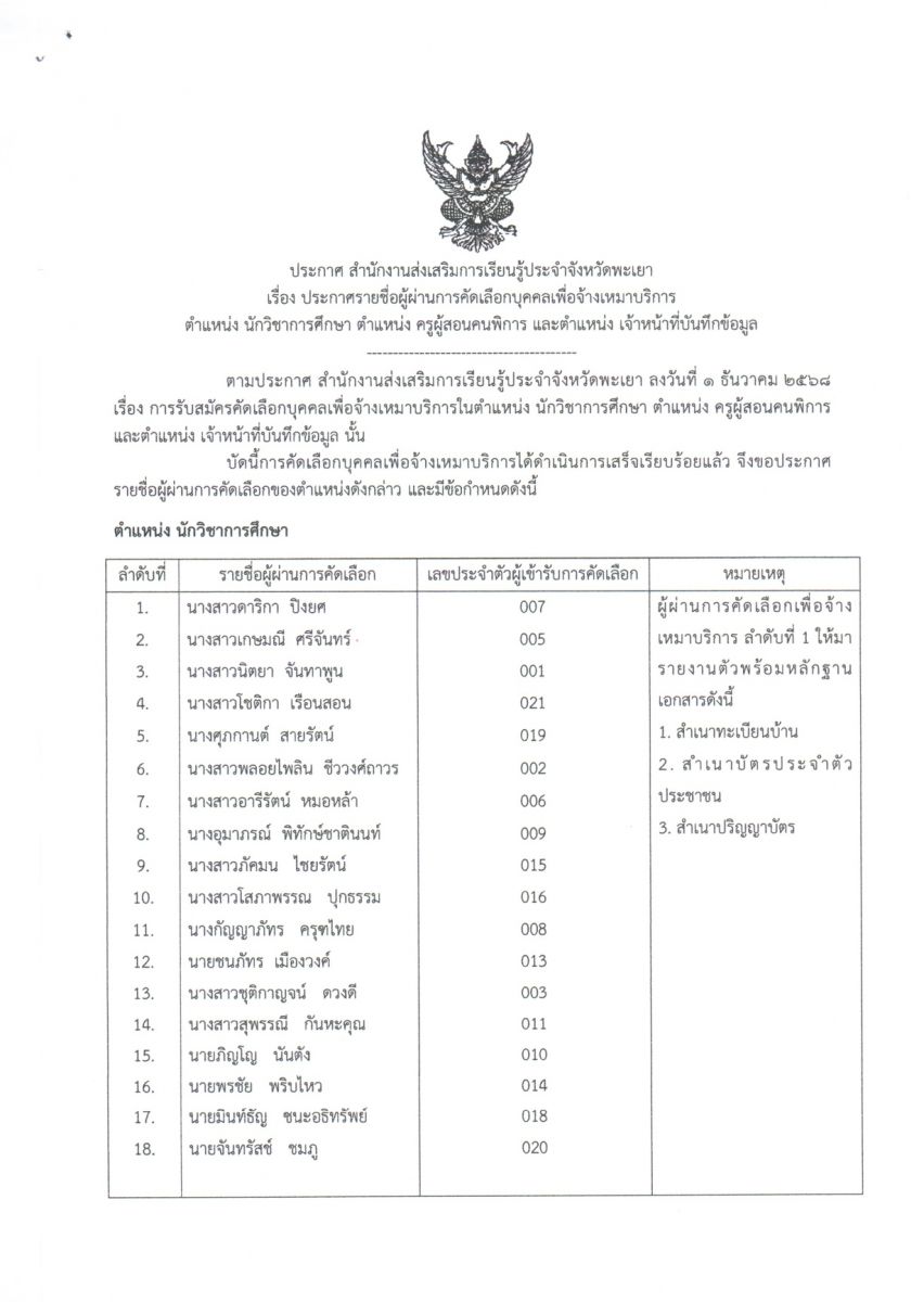 ประกาศ สำนักงานส่งเสริมการเรียนรู้ประจำจังหวัดพะเยา เรื่อง รายชื่อผู้มีสิทธิ์เข้ารับการคัดเลือกเพื่อจ้างเหมาบริการ กำหนดวัน เวลา สถานที่ในการคัดเลือก...