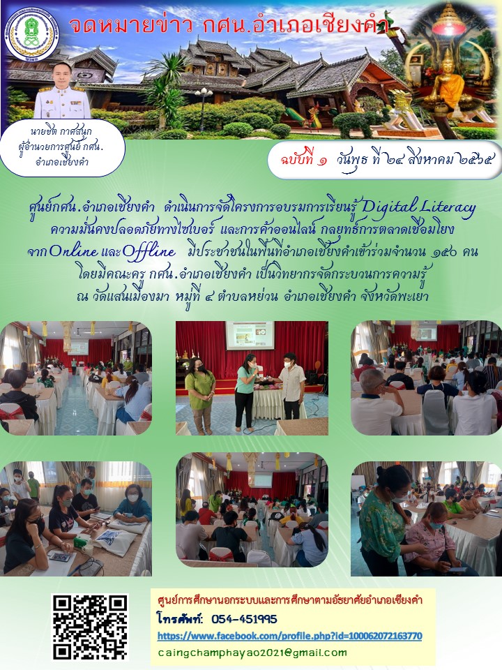วันที่ 23-24 สิงหาคม 2565 ประชาชนในพื้นที่ตำบลแม่ลาว จำนวน 15 คน เข้าร่วมโครงการอบรมการเรียนรู้ Digital Literacy ความมั่นคงปลอดภัยทางไซเบอร์และการค้าอ...