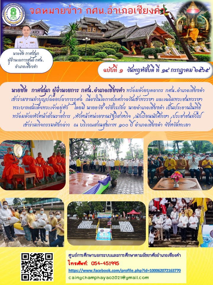 วันที่ 14 กรกฏาคม 2565 คณะครูกศน.ตำบลแม่ลาวได้เข้าร่วมโครงการทำบุญปล่อยปลาการกุศล เนื่องในวันเทศกาลเข้าพรรษาและเฉลิมพระชนมพรรษาพระบาทสมเด็จพระเจ้าอย...