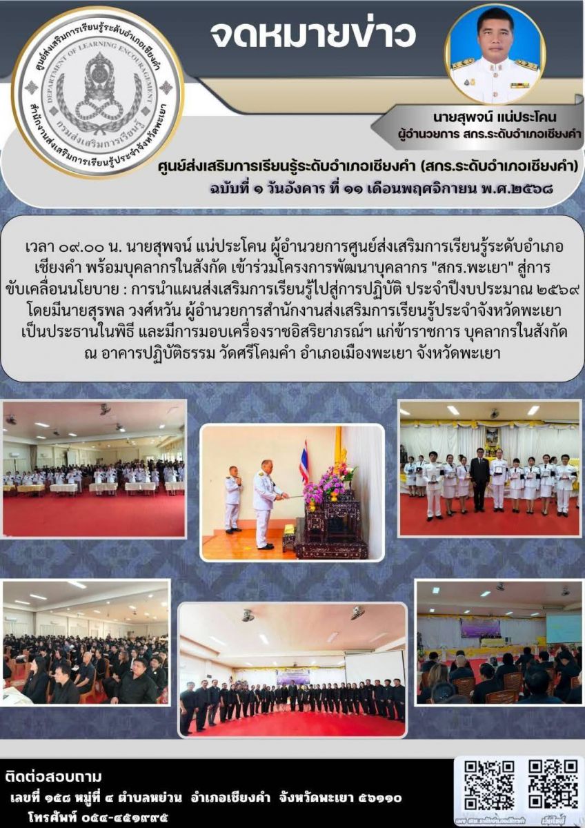 โครงการพัฒนาบุคลากร"สกร.พะเยา" สู่การขับเคลื่อนนโยบาย : การนำแผนส่งเสริมการเรียนรู้ไปสู่การปฏิบัติ ประจำปีงบประมาณ ๒๕๖๙ ...