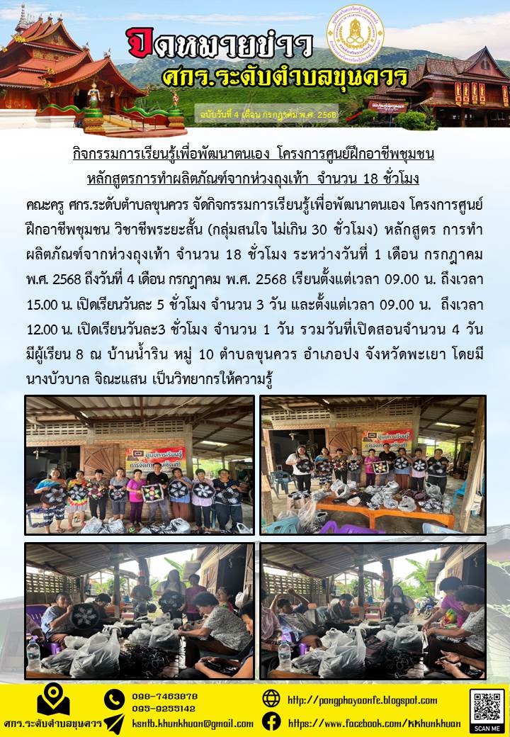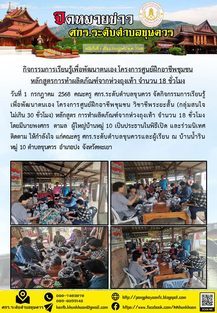 วันที่ 1 กรกฎาคม 2568 คณะครู ศกร.ระดับตำบลขุนควร จัดกิจกรรมการเรียนรู้เพื่อพัฒนาตนเอง โครงการศูนย์ฝึกอาชีพชุมชน วิชาชีพระยะสั้น (กลุ่มสนใจไม่เกิน 30 ช...