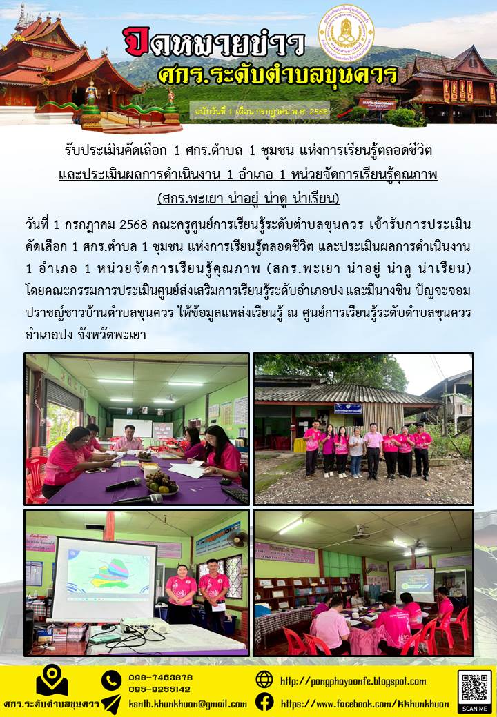 วันที่ 1 กรกฎาคม 2568 คณะครูศูนย์การเรียนรู้ระดับตำบลขุนควร เข้ารับการประเมินคัดเลือก 1 ศกร.ตำบล 1 ชุมชน แห่งการเรียนรู้ตลอดชีวิต และประเมินผลการดำเนิ...