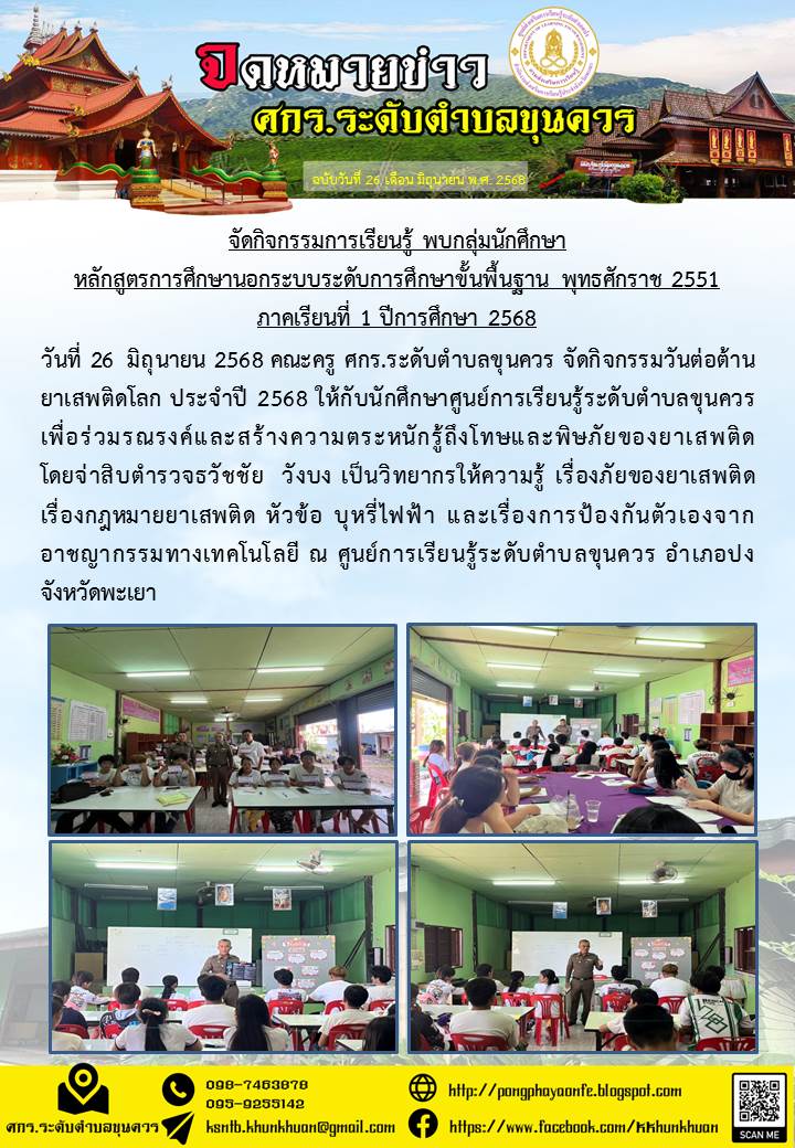 วันที่ 26 มิถุนายน 2568 คณะครู ศกร.ระดับตำบลขุนควร จัดกิจกรรมวันต่อต้านยาเสพติดโลก ประจำปี 2568 ให้กับนักศึกษาศูนย์การเรียนรู้ระดับตำบลขุนควร เพื่อร่ว...