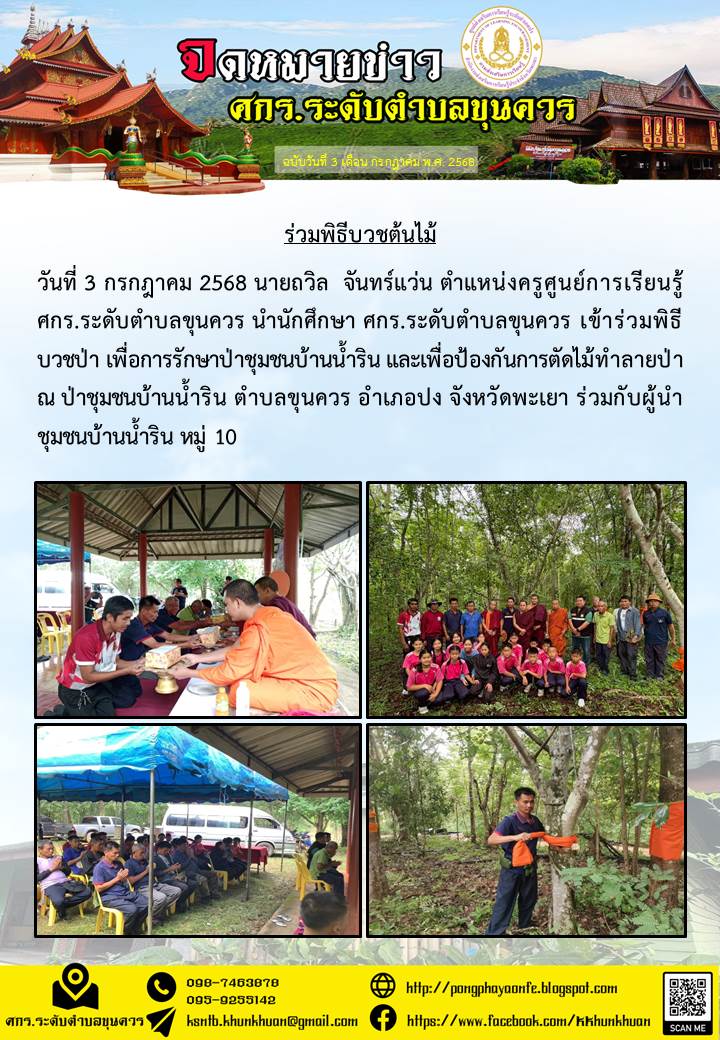 วันที่ 3 กรกฎาคม 2568 นายถวิล จันทร์แว่น ตำแหน่งครูศูนย์การเรียนรู้ ศกร.ระดับตำบลขุนควร นำนักศึกษา ศกร.ระดับตำบลขุนควร เข้าร่วมพิธีบวชป่า เพื่อการรั...