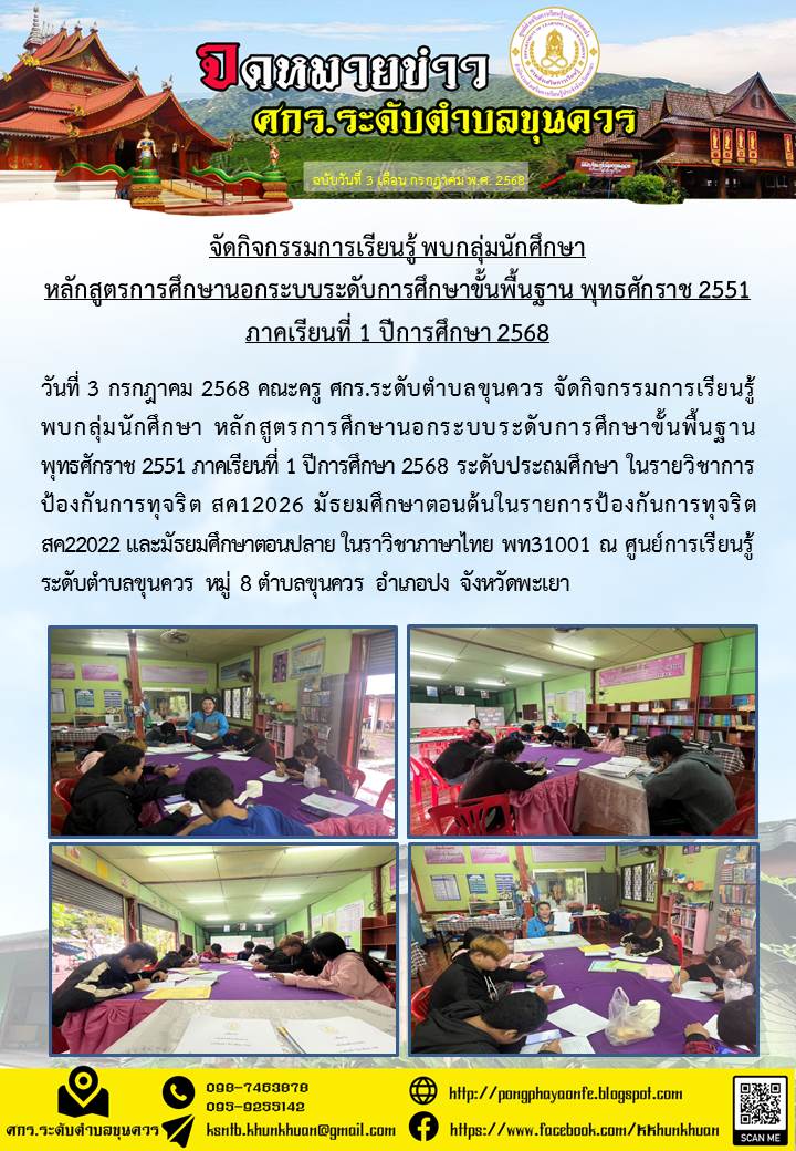 วันที่ 3 กรกฎาคม 2568 คณะครู ศกร.ระดับตำบลขุนควร จัดกิจกรรมการเรียนรู้ พบกลุ่มนักศึกษา หลักสูตรการศึกษานอกระบบระดับการศึกษาขั้นพื้นฐาน พุทธศักราช 2551...