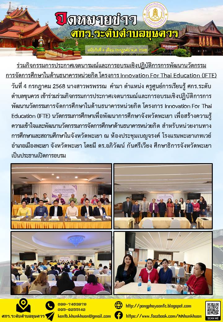 วันที่ 4 กรกฎาคม 2568 นางสาวพรพรรณ คำมา ตำแหน่ง ครูศูนย์การเรียนรู้ ศกร.ระดับตำบลขุนควร เข้าร่วมร่วมกิจกรรมการประกาศเจตนารมณ์และการอบรมเชิงปฏิบัติการ...