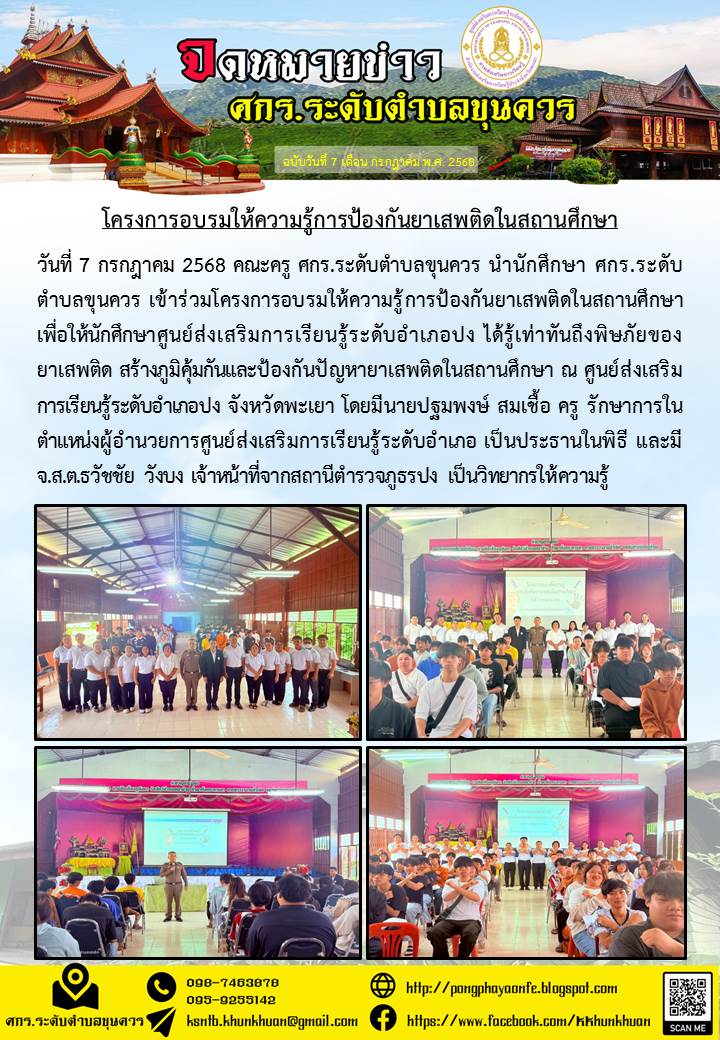 วันที่ 7 กรกฎาคม 2568 คณะครู ศกร.ระดับตำบลขุนควร นำนักศึกษา ศกร.ระดับตำบลขุนควร เข้าร่วมโครงการอบรมให้ความรู้การป้องกันยาเสพติดในสถานศึกษา...