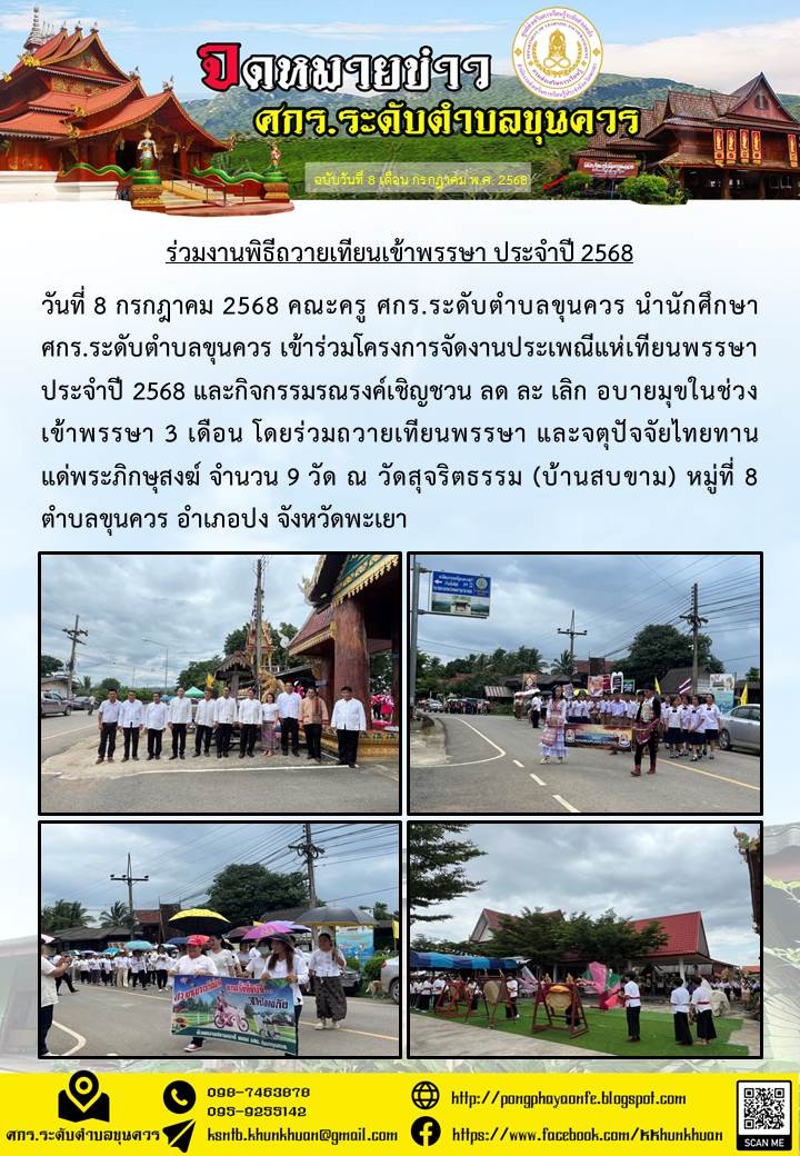 วันที่ 8 กรกฎาคม 2568 คณะครู ศกร.ระดับตำบลขุนควร นำนักศึกษา ศกร.ระดับตำบลขุนควร เข้าร่วมโครงการจัดงานประเพณีแห่เทียนพรรษา ประจำปี 2568 และกิจกรรมรณรงค...