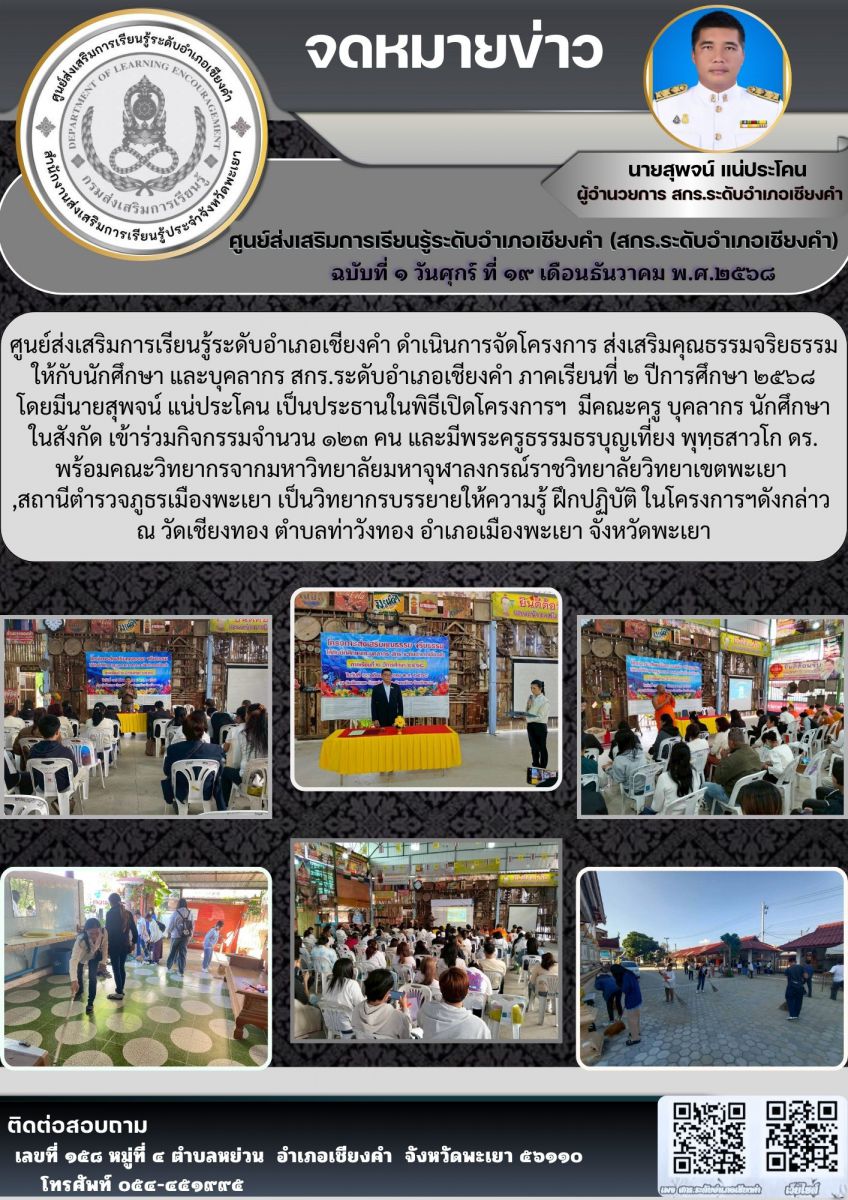 นำนักศึกษาเข้าร่วมโครงการส่งเสริมคุณธรรมจริยธรรมให้กับนักศึกษา และบุคลากร สกร.ระดับอำเภอเชียงคำ ภาคเรียนที่ ๒ ปีการศึกษา ๒๕๖๘ ...