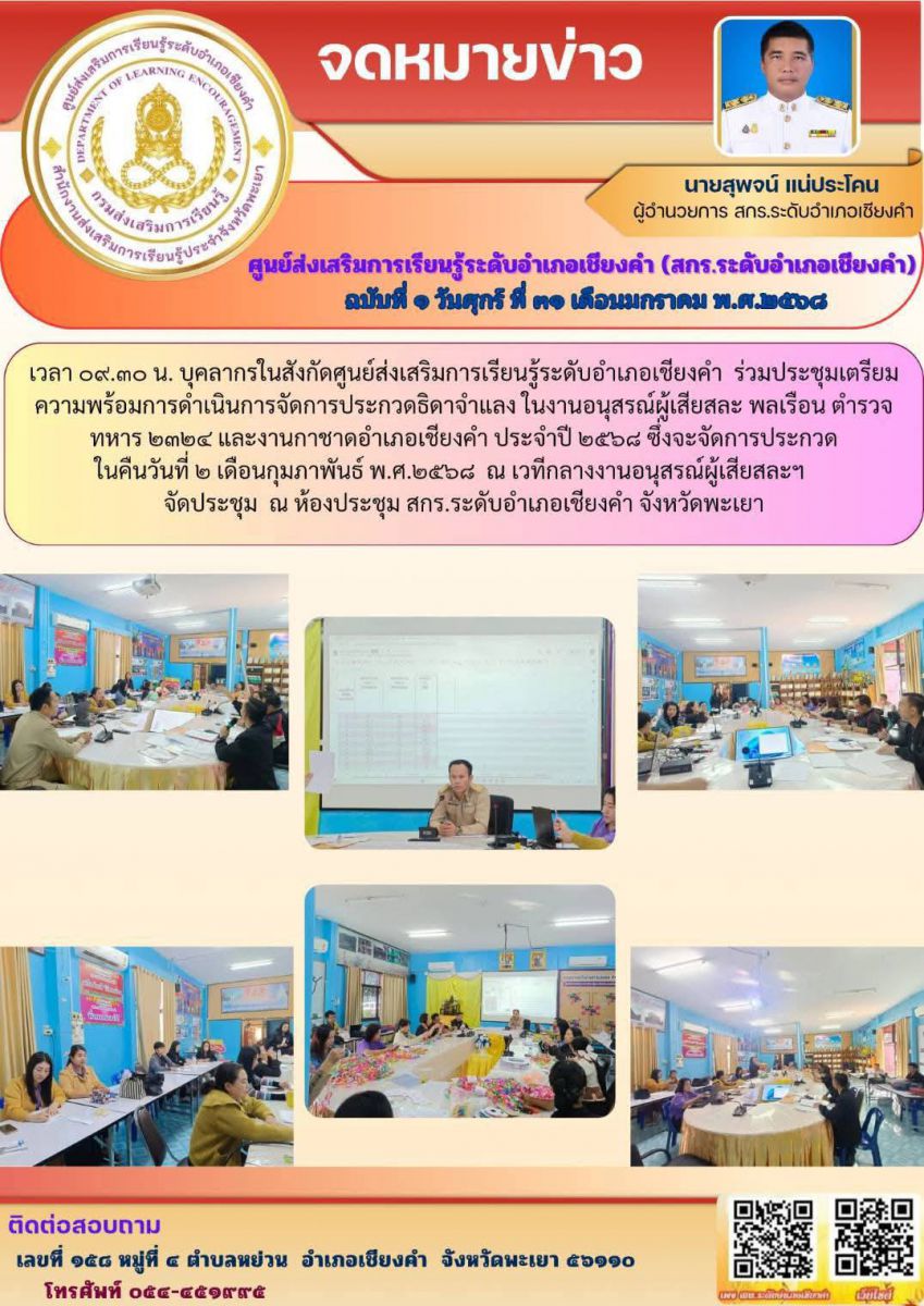 วันที่ 5 กันยายน 2568 เวลา 13.00 น. นายสุพจน์ แน่ประโคน ผู้อำนวยการศูนย์ส่งเสริมการเรียนรู้ระดับอำเภอเชียงคำ เป็นประธานดำเนินการประชุมบุคลากรพร้อมด้วย...