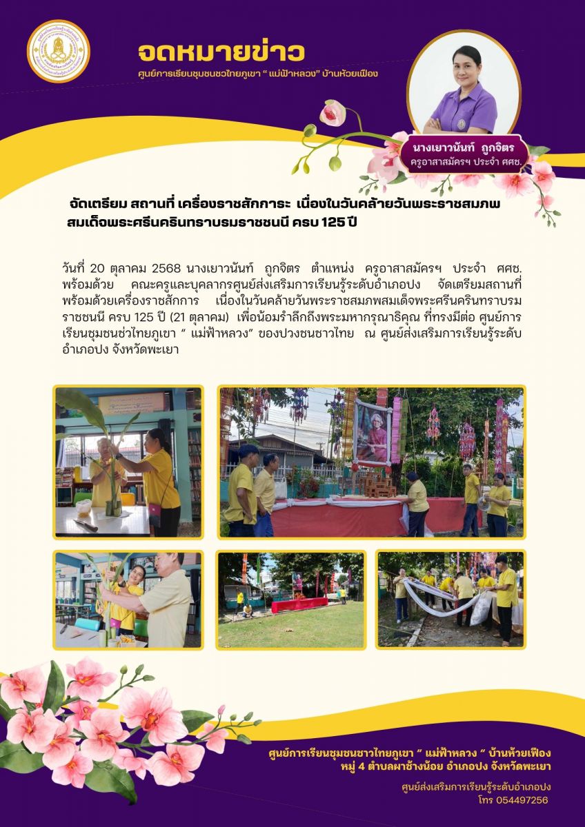 จัดเตรียมสถานที่ พร้อมด้วยเครื่องราชสักการ เนื่องในวันคล้ายวันพระราชสมภพสมเด็จพระศรีนครินทราบรมราชชนนี ครบ 125 ปี (21 ตุลาคม) ...