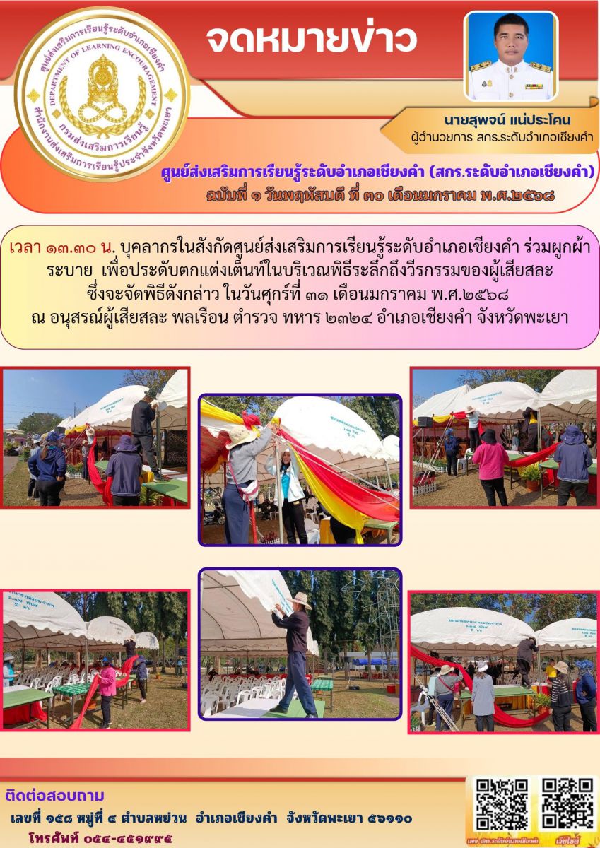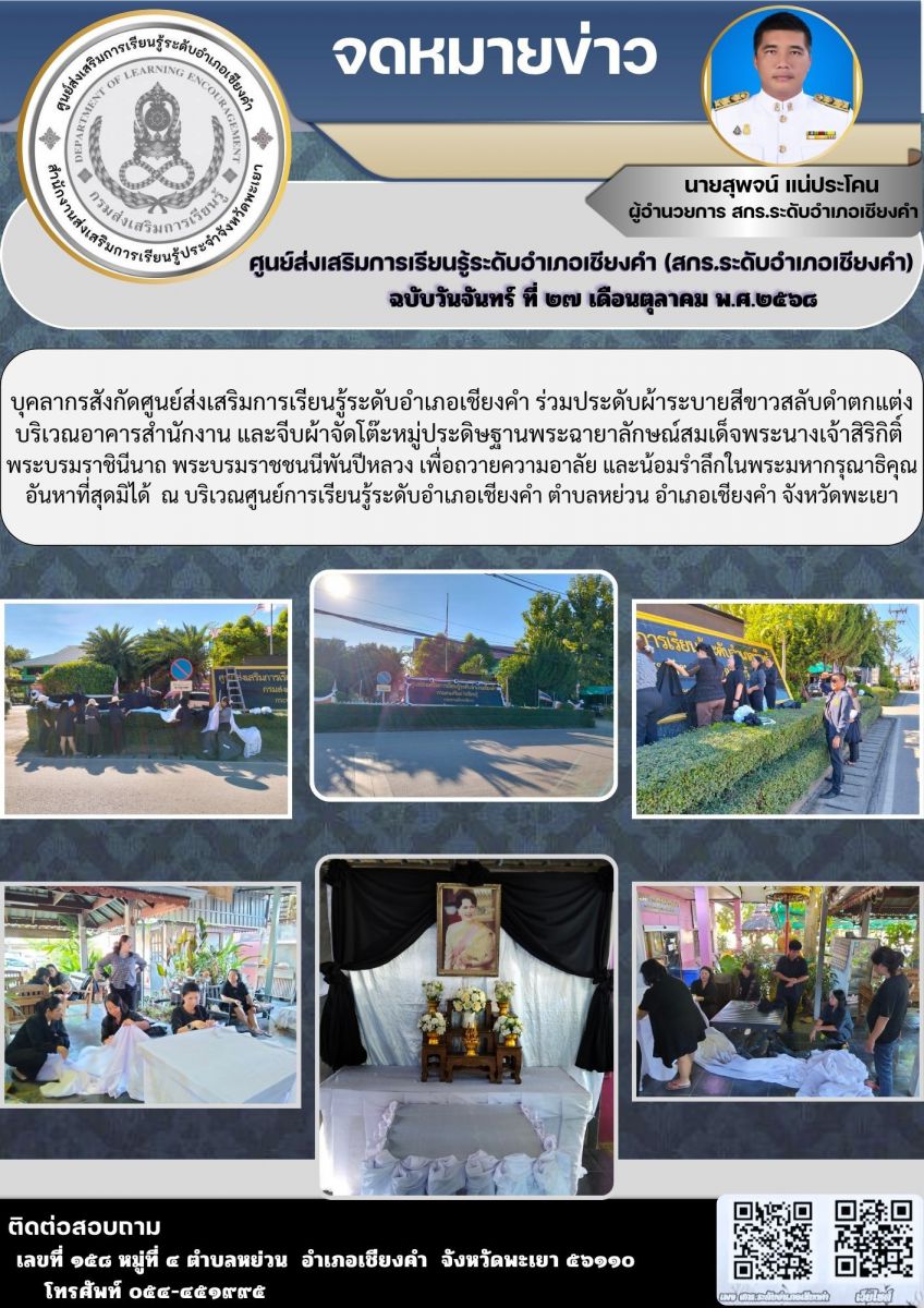 ร่วมประดับผ้าระบายสีขาว-ดำ ตกแต่งบริเวณป้ายสำนักงาน และจีบผ้าจัดโต๊ะหมู่ประดิษฐาน...