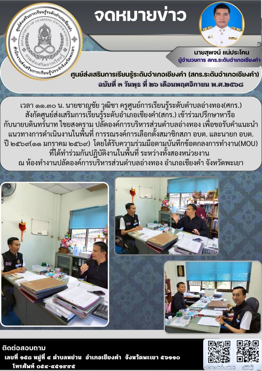 ข่าวประชาสัมพันธ์ จากศูนย์ส่งเสริมพัฒนาประชาธิปไตย (ศส.ปชต.) ประจำตำบลอ่างทอง อำเภอเชียงคำ จังหวัดพะเยา...