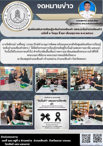 ร่วมจัดกิจกรรมการเรียนรู้ประดิษฐ์ริบบิ้นผ้าแสดงความอาลัย และแจกริบบิ้นให้กับประชาชนทั่วไป...
